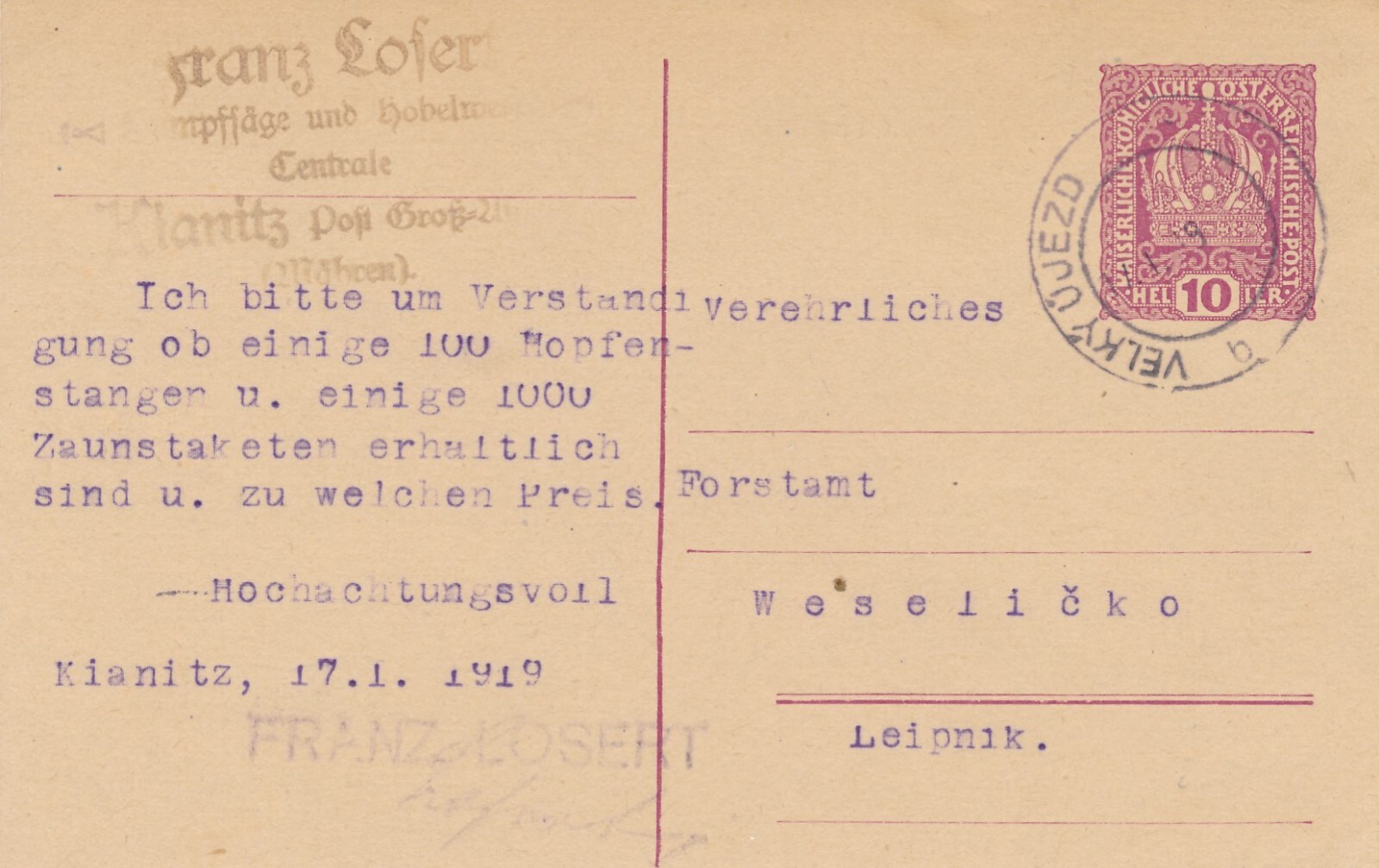 10 Heller - Ganzsachen - 1919 aus Velkyüjezd (10642)