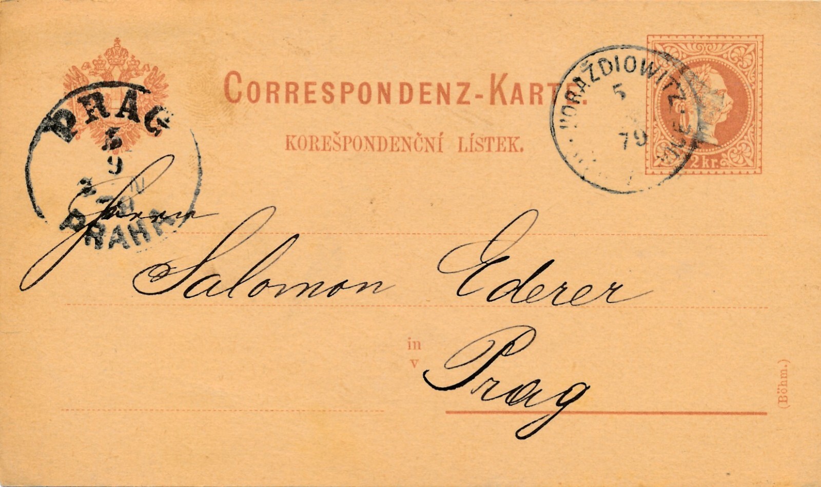 2 Kreuzer - Ganzsachen - Karte 1879 aus Horazdiowitz (13591)