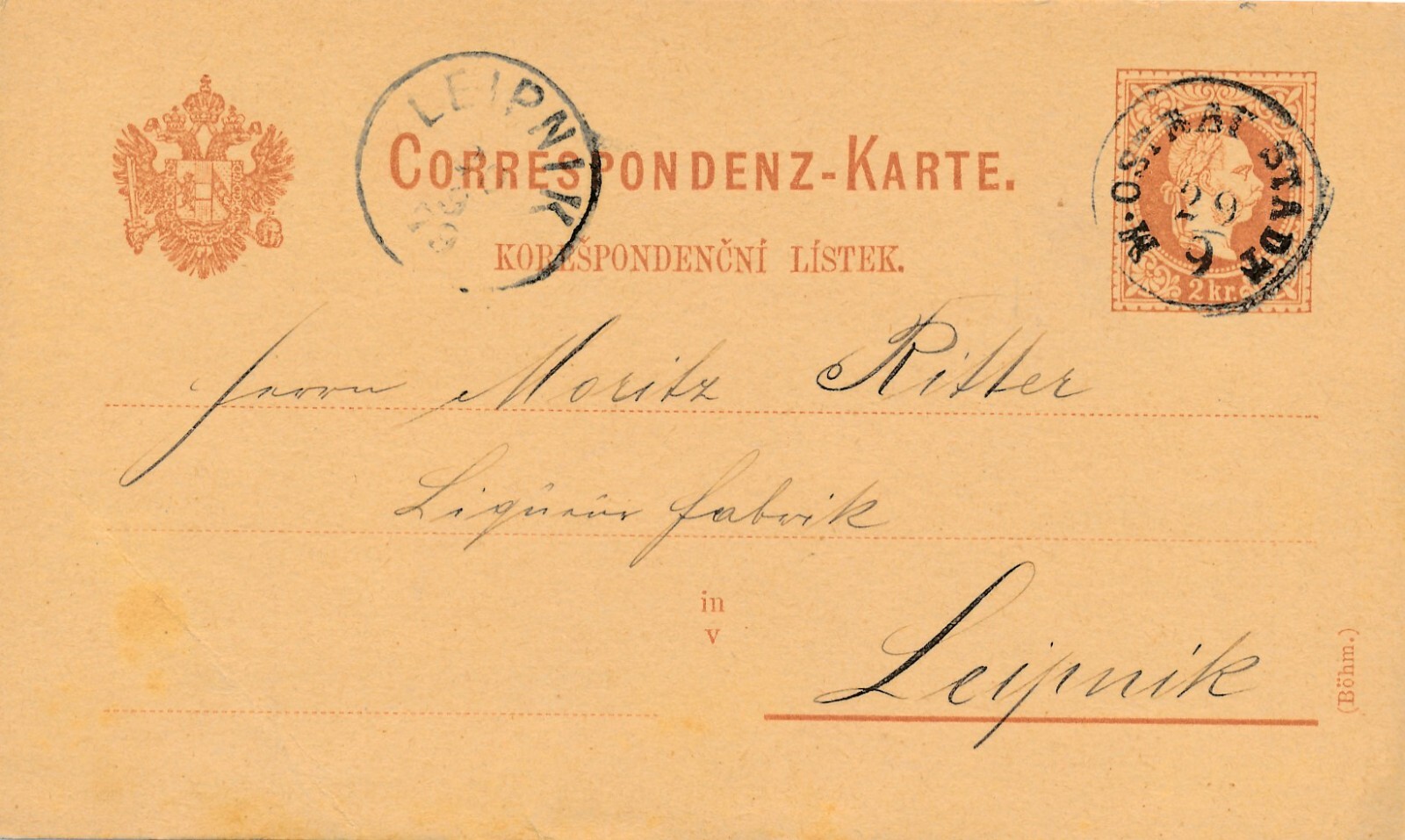 2 Kreuzer - Ganzsachen - Karte 1879 aus M. Ostrat Stadt (13578)