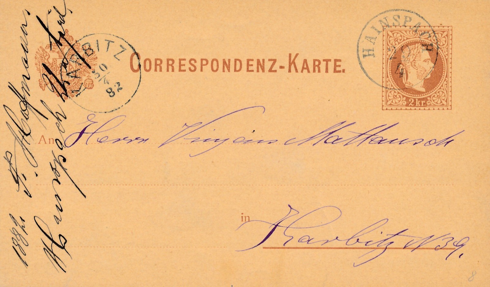 2 Kreuzer - Ganzsachen Karte 1882 aus Hainspach (11134)