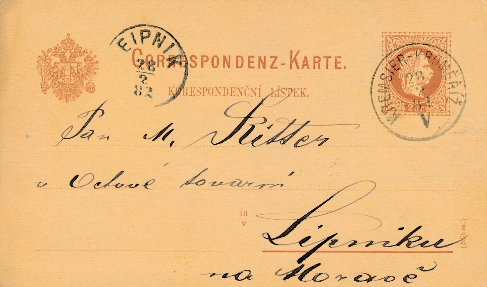 2 Kreuzer - Ganzsachen - Karte 1882 aus Kremsier Römeritz (13580)