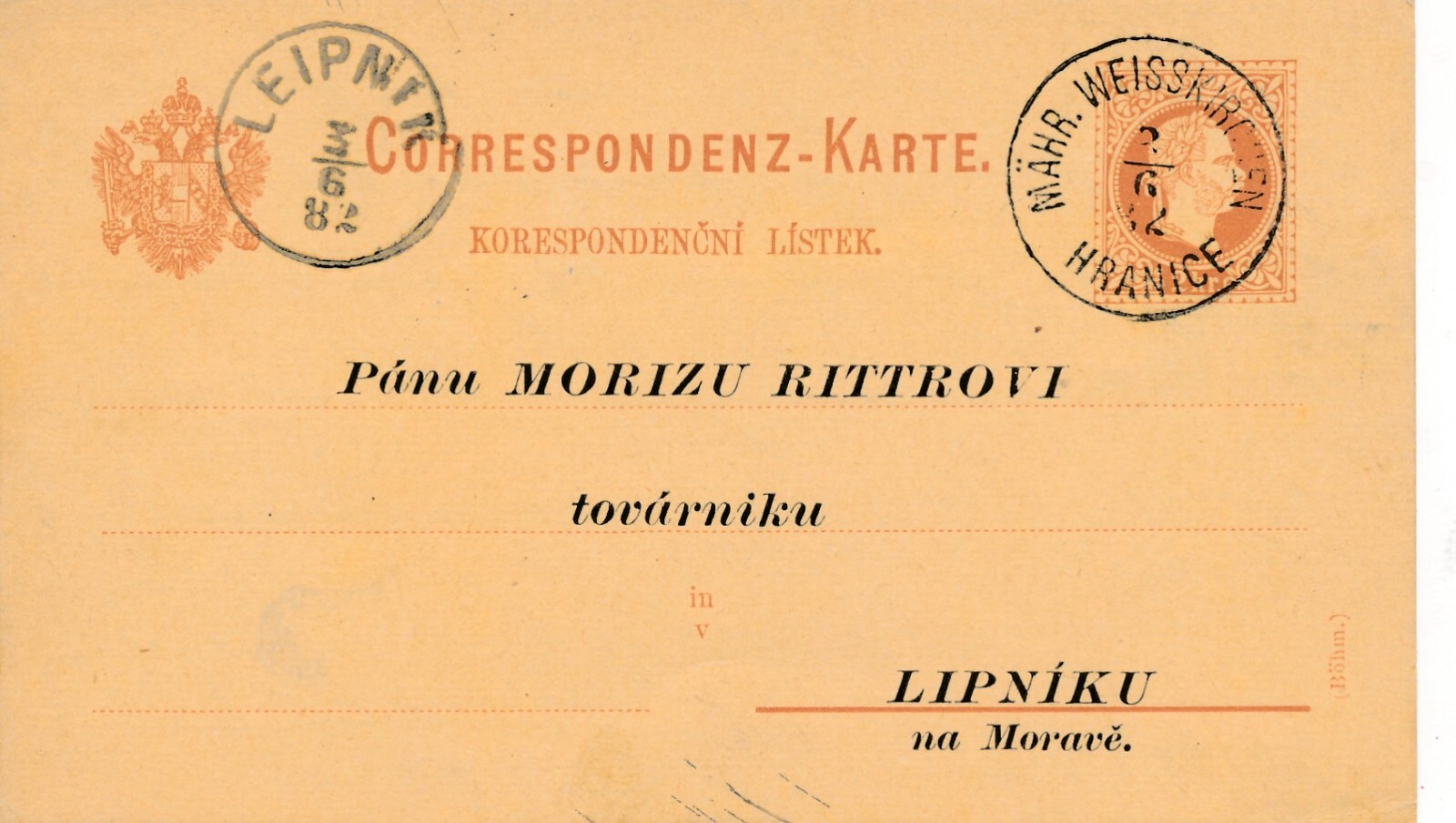 2 Kreuzer - Ganzsachen - Karte 1882 aus Mähr Weisskirchen (10184)