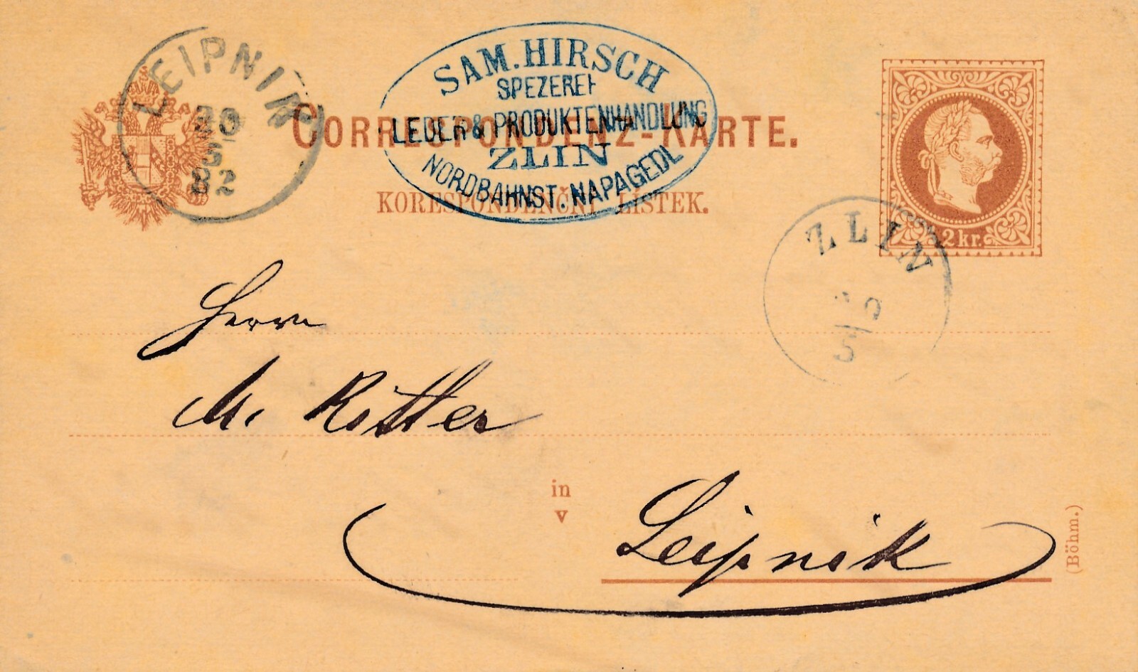 2 Kreuzer - Ganzsachen - Karte 1882 aus Zlinn (10095)