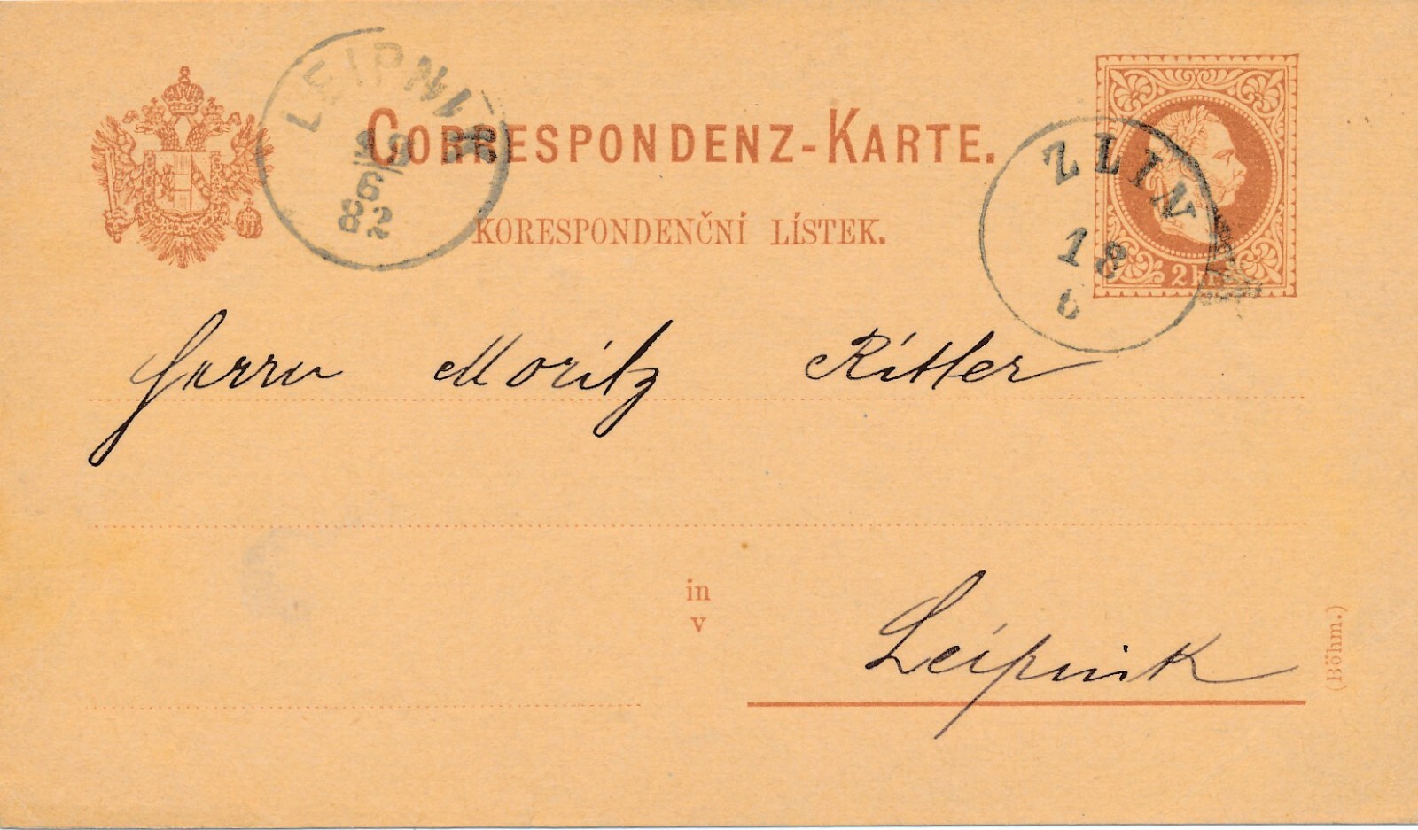 2 Kreuzer - Ganzsachen - Karte 1882 aus Zlinn (10096)