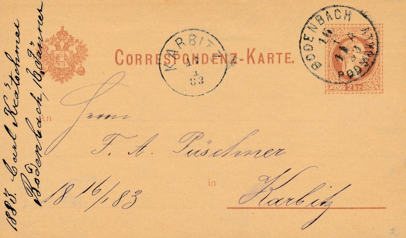 2 Kreuzer - Ganzsachen - Karte 1883 aus Bodenbach (10054)