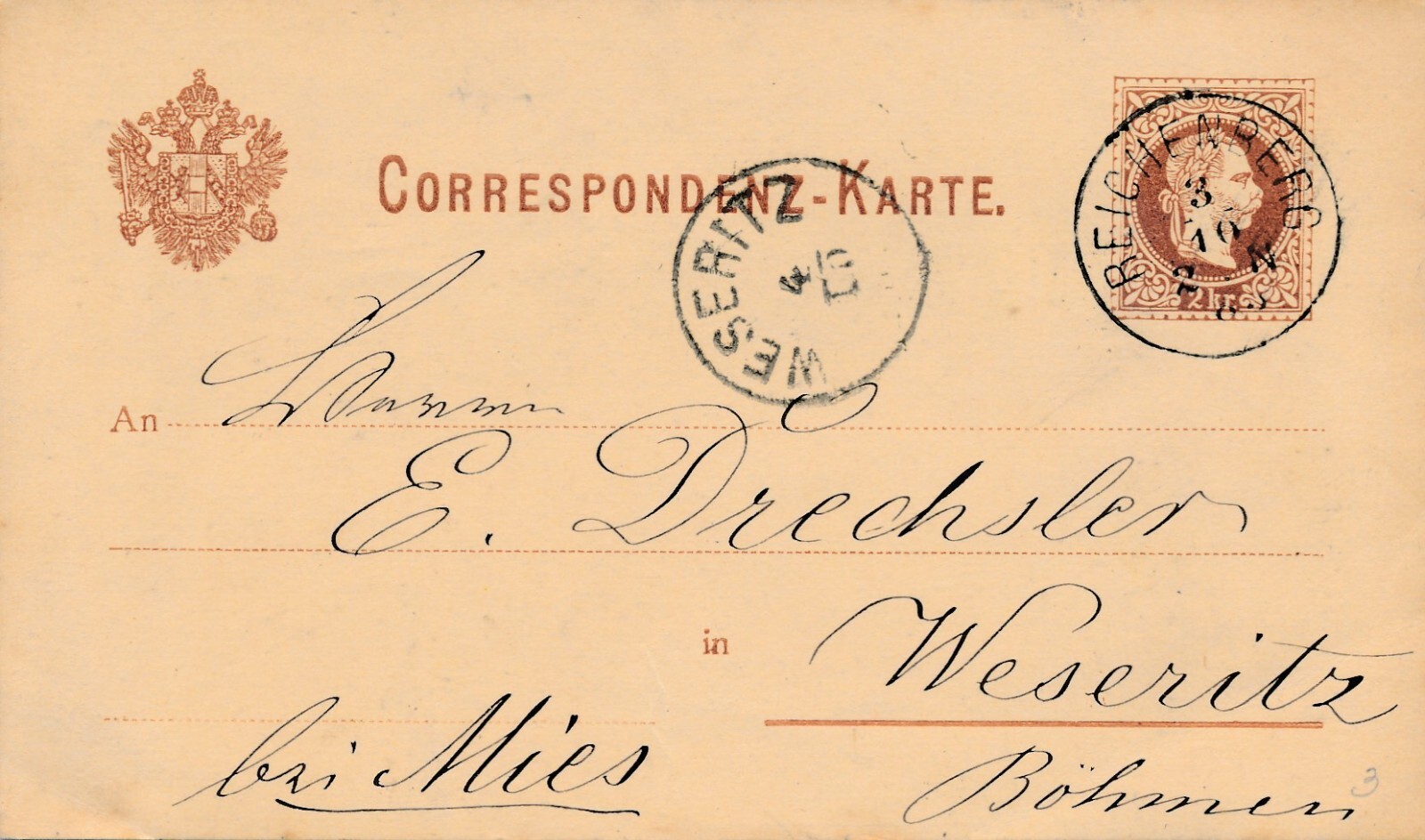 2 Kreuzer - Ganzsachen Karte 1883 aus Reichenberg (11151)