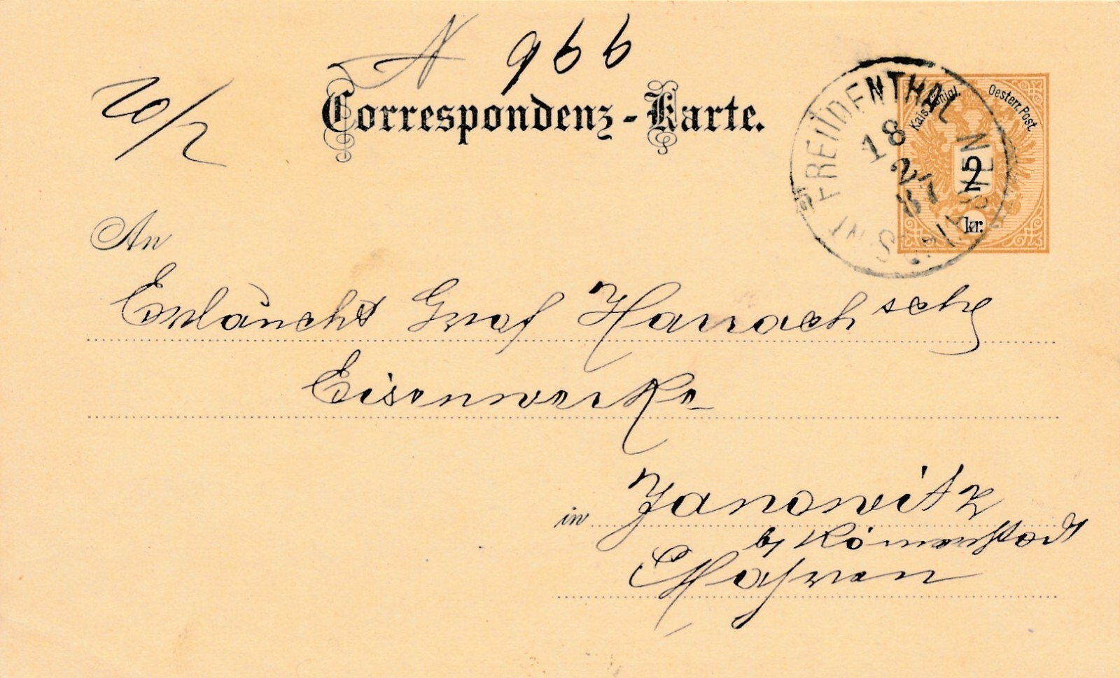 2 Kreuzer - Ganzsachen - Karte 1887 aus Freudenthal (10701)
