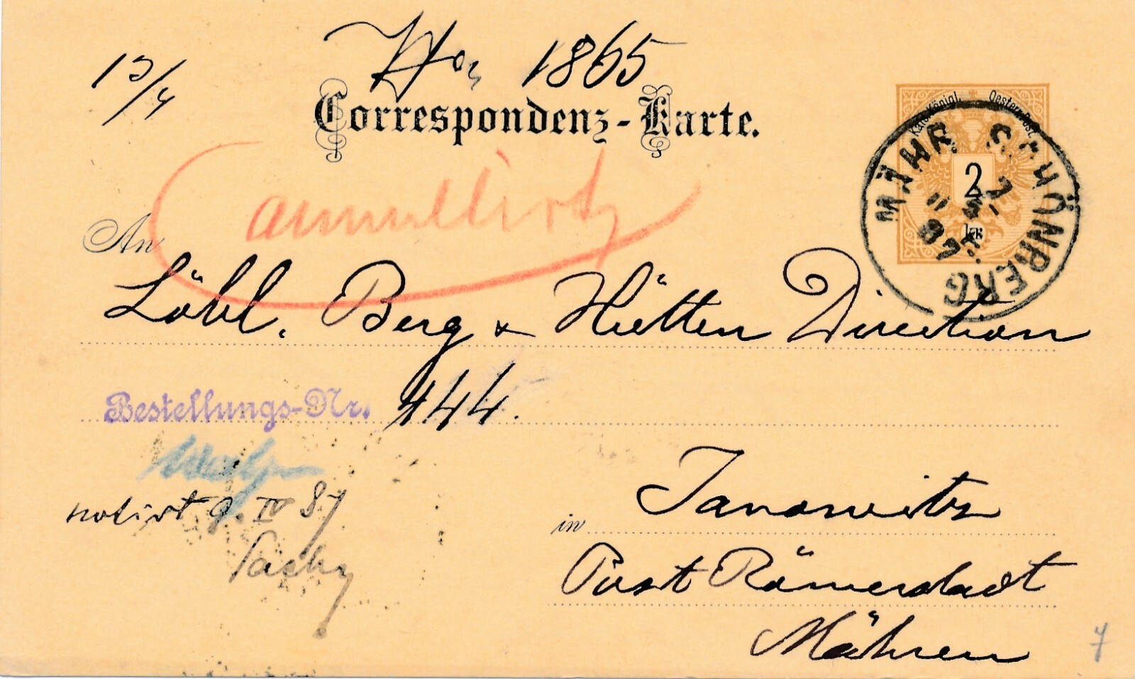 2 Kreuzer - Ganzsachen - Karte 1887 aus Mähr Schönberg (10704)
