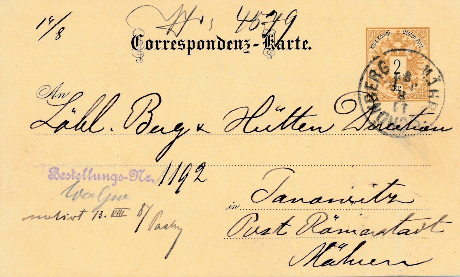 2 Kreuzer - Ganzsachen - Karte 1887 aus Schönberg (10683)