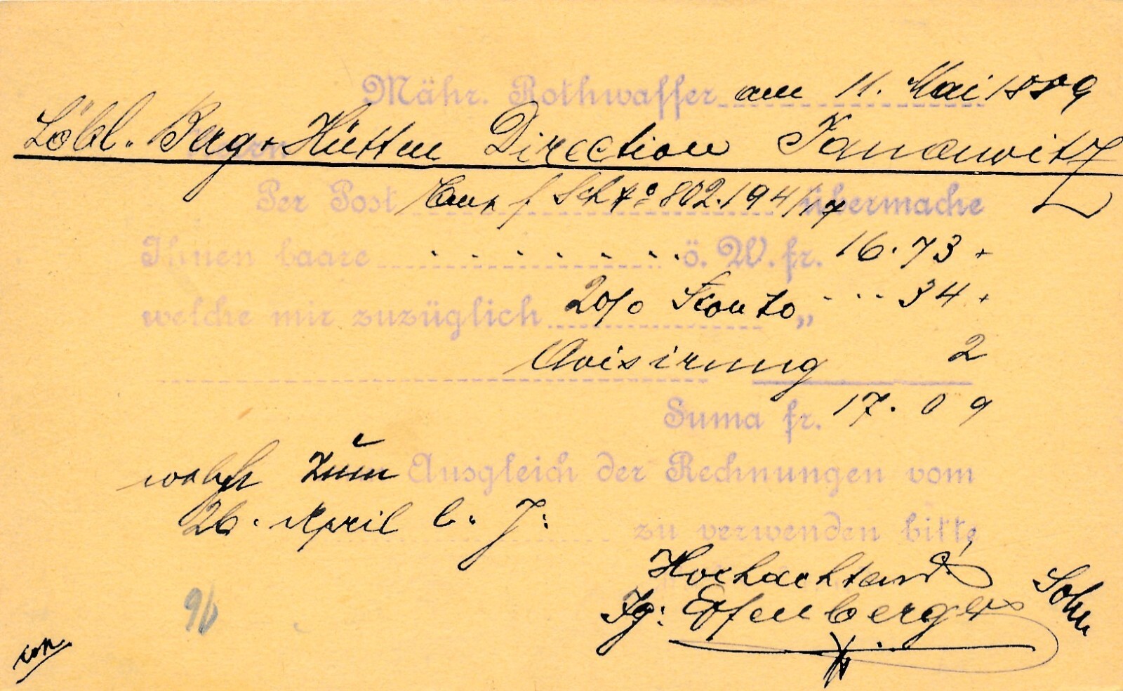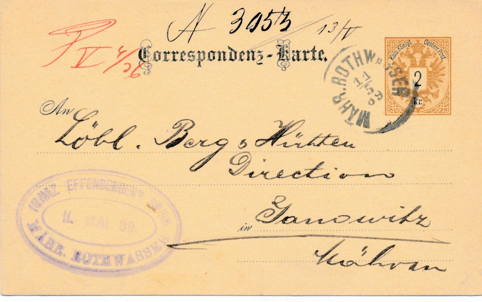 2 Kreuzer - Ganzsachen - Karte 1889 aus Mähr. Rothwasser (13357)