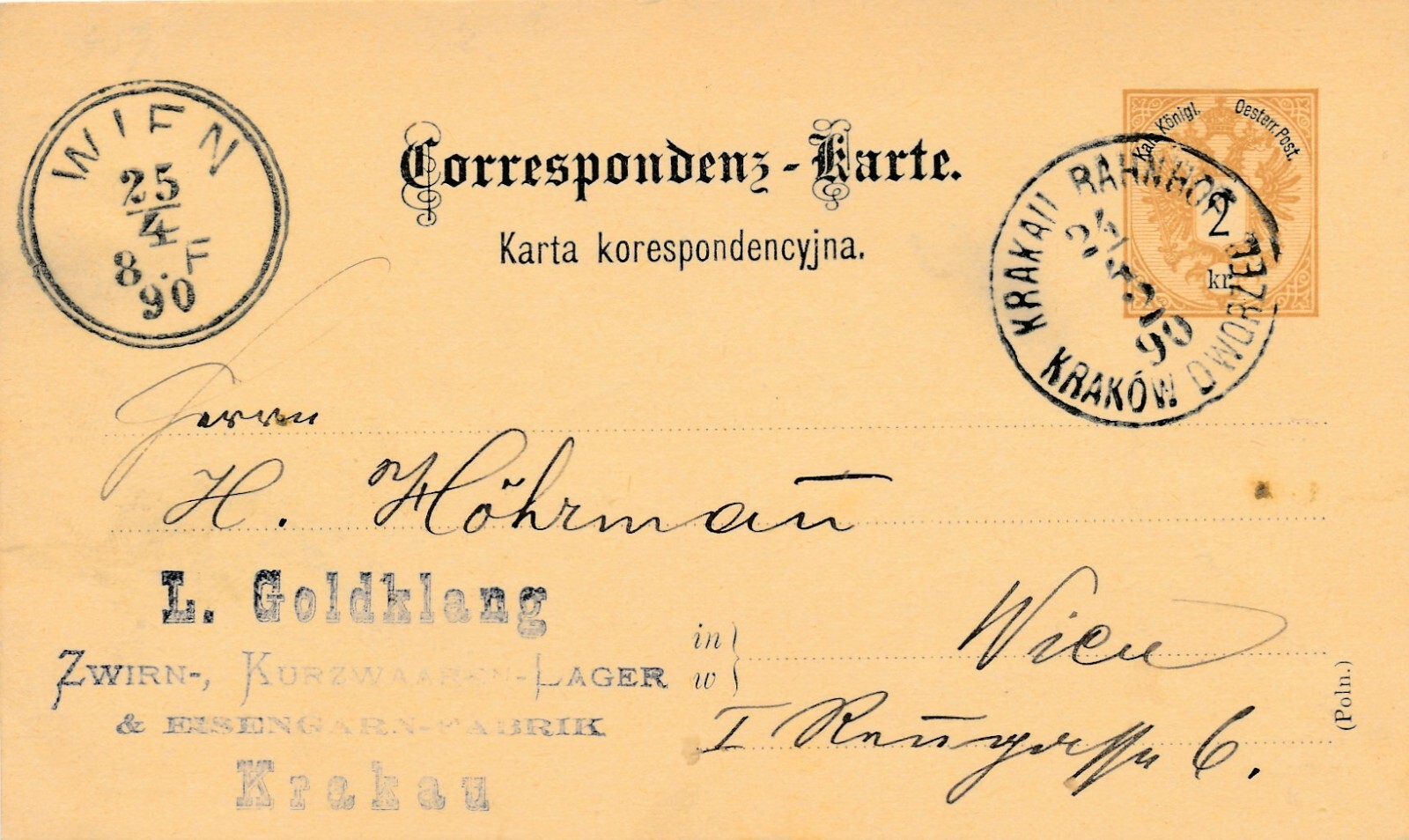 2 Kreuzer Ganzsachen - Karte 1890 aus Krakau Bahnhof (11189)