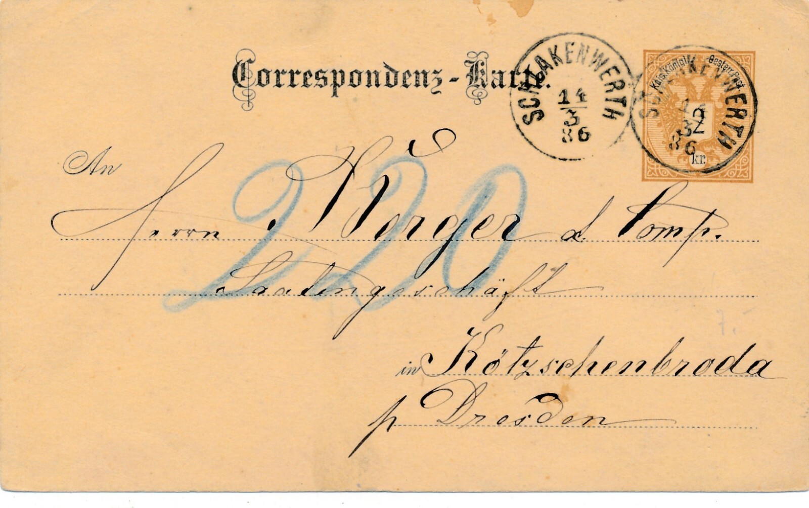 2 Kreuzer - Ganzsachen - Karte aus 1886 aus Schlakenwerth (11338)