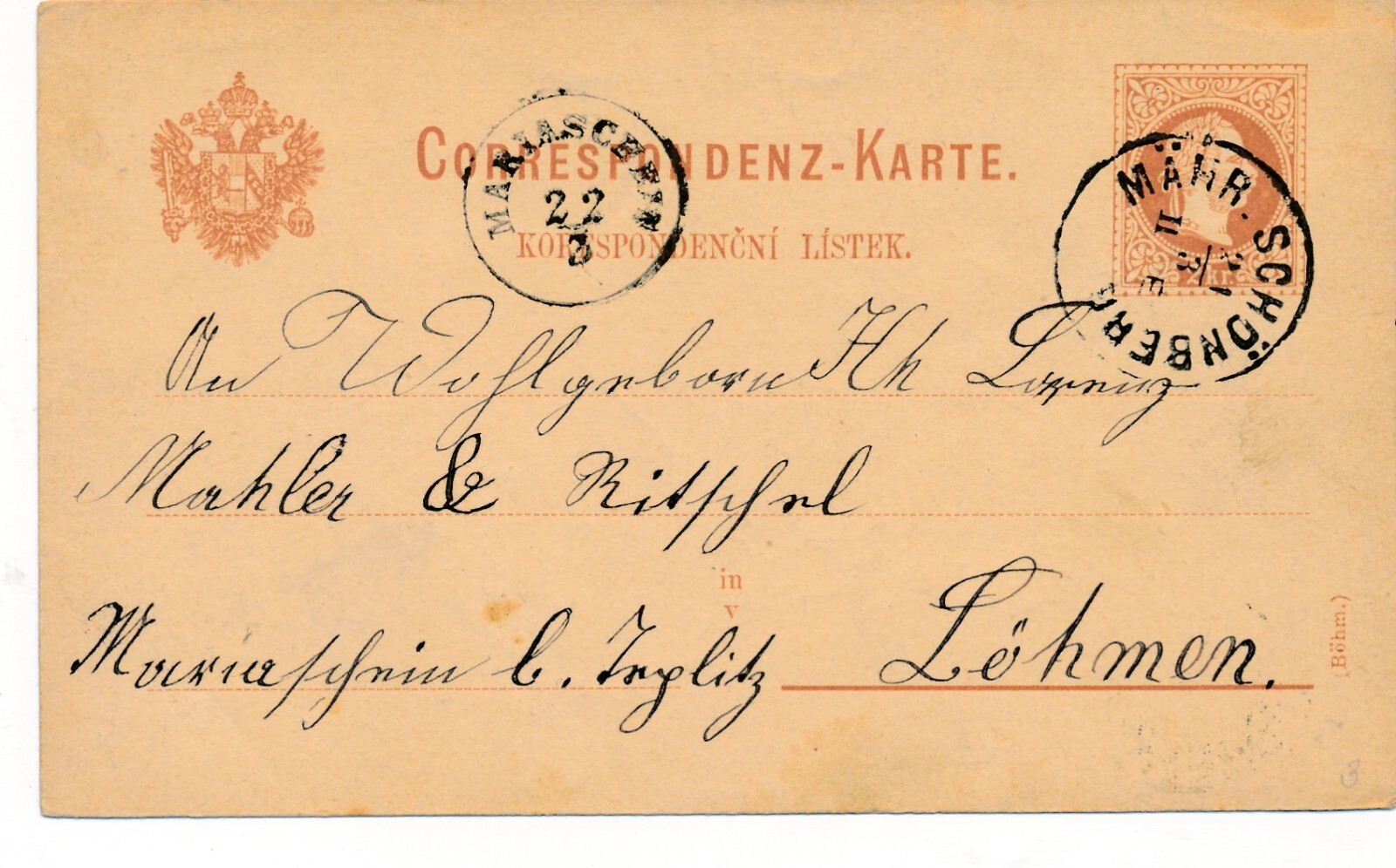 2 Kreuzer - Ganzsachen - Karte aus Mähr Schönberg (10185)