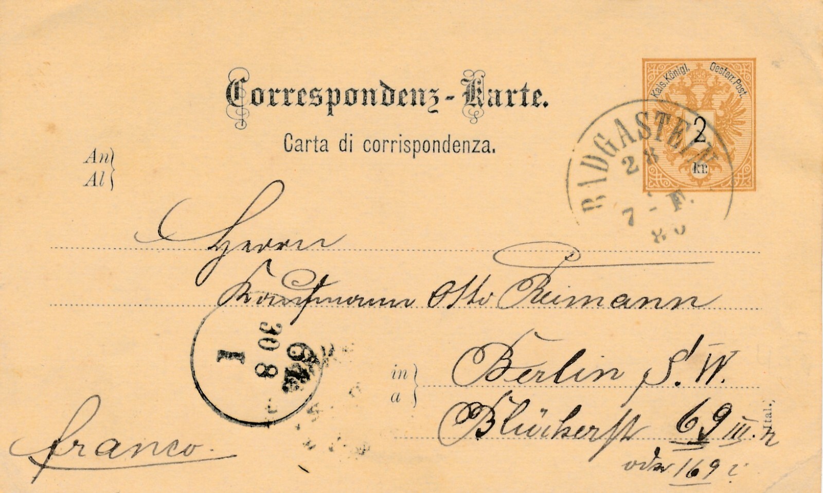 2 Kreuzer Ganzsachen - Karte (Ital) 1880 aus Badgastein (10541)
