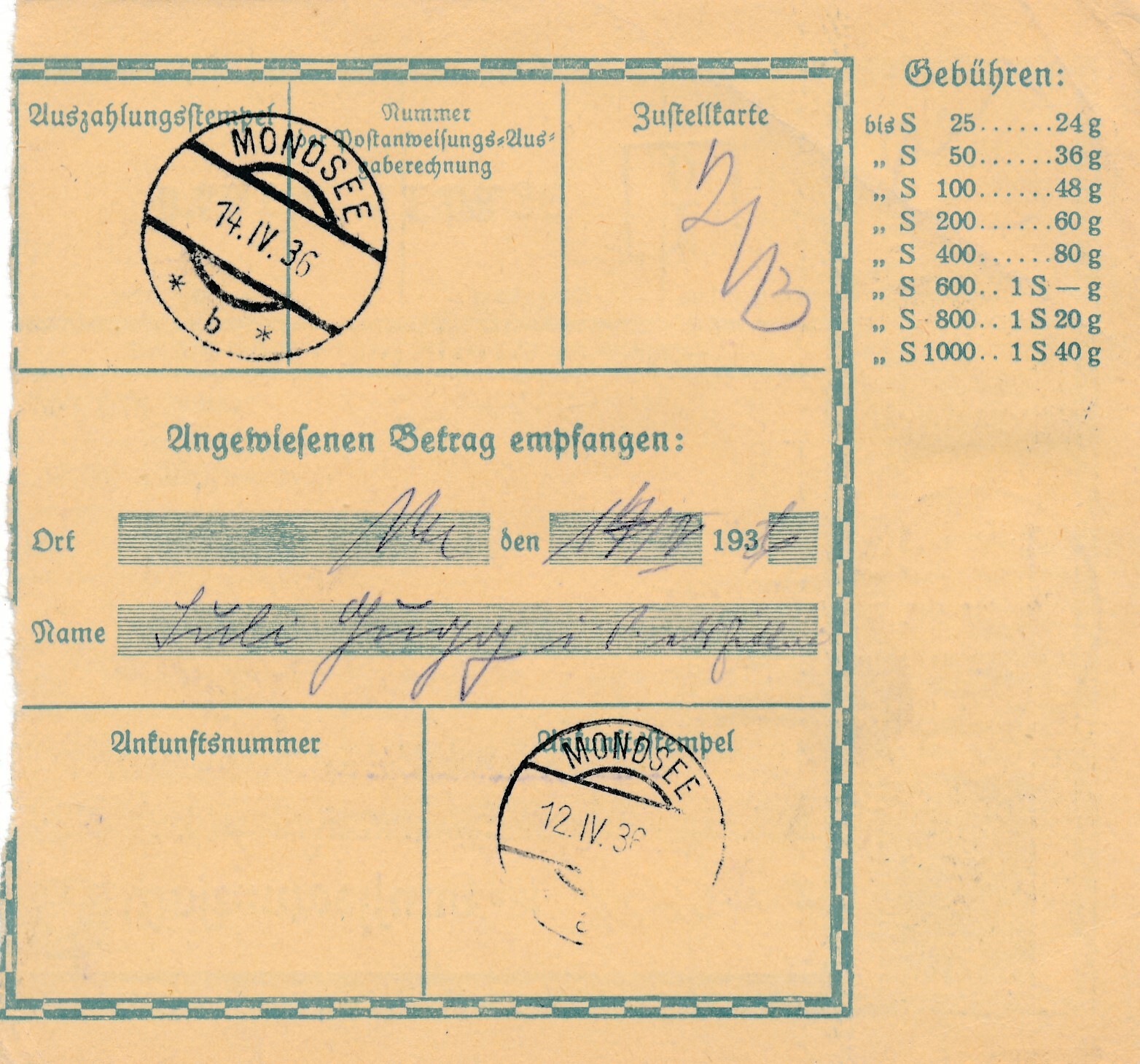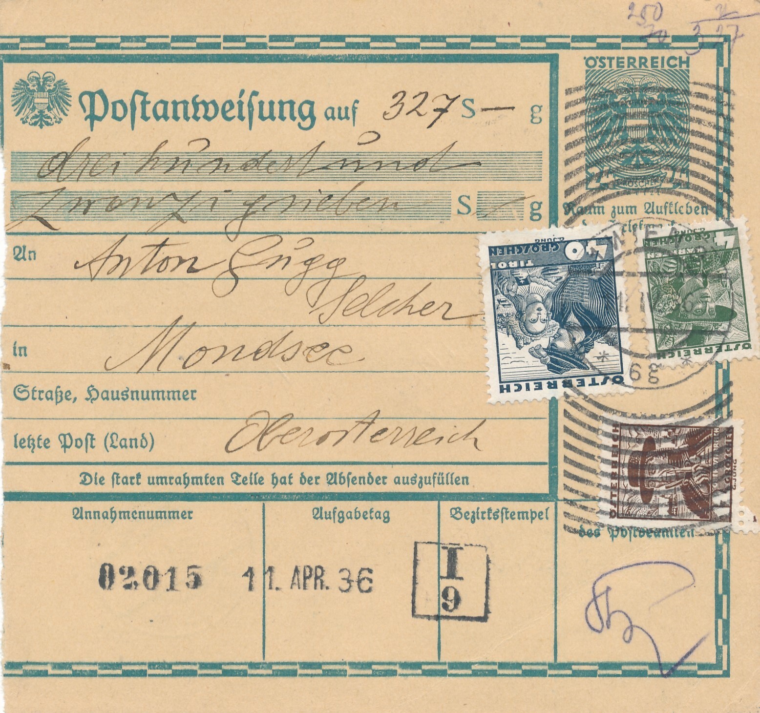 24 Gr. Postanweisung 1936 aus Wien nach Horn + Trachten Marken (10391)