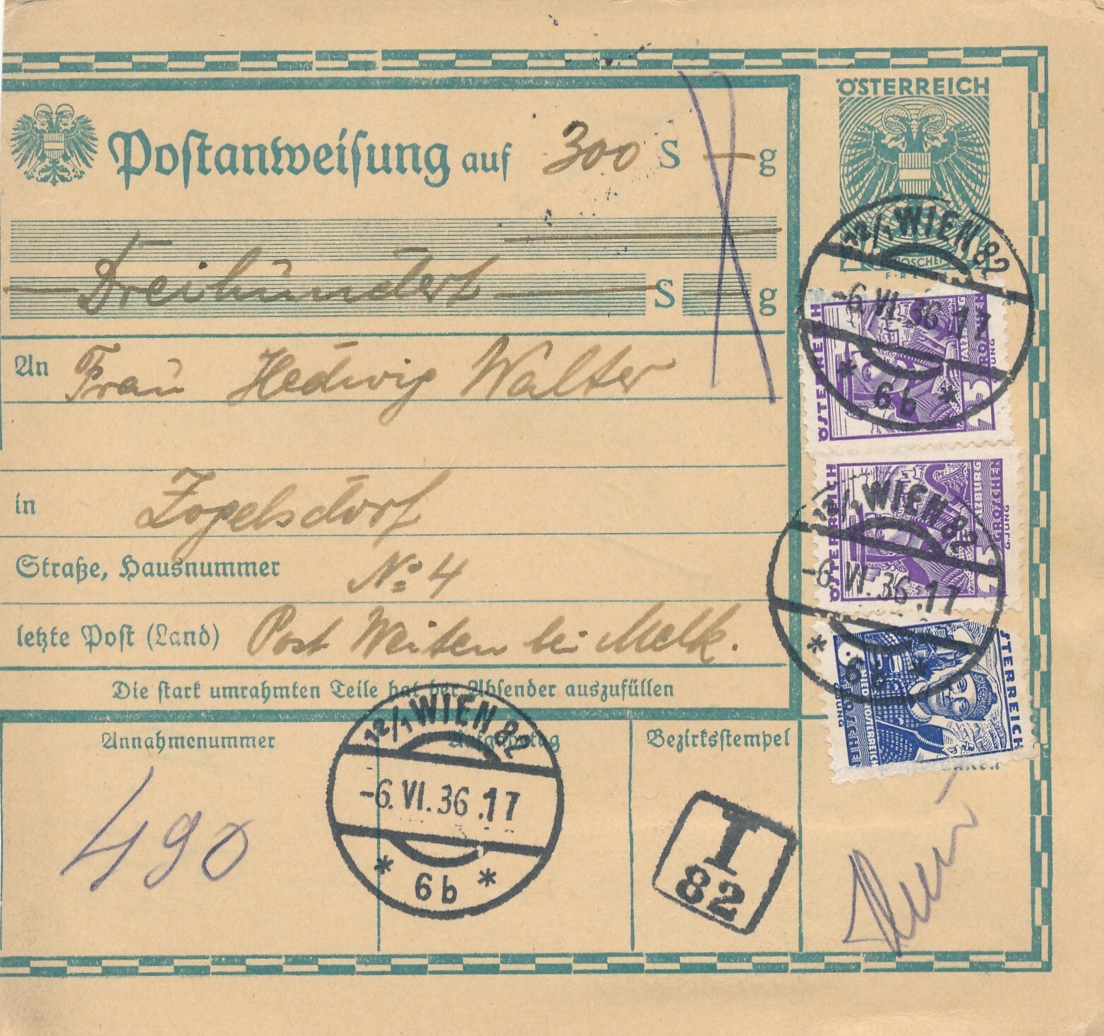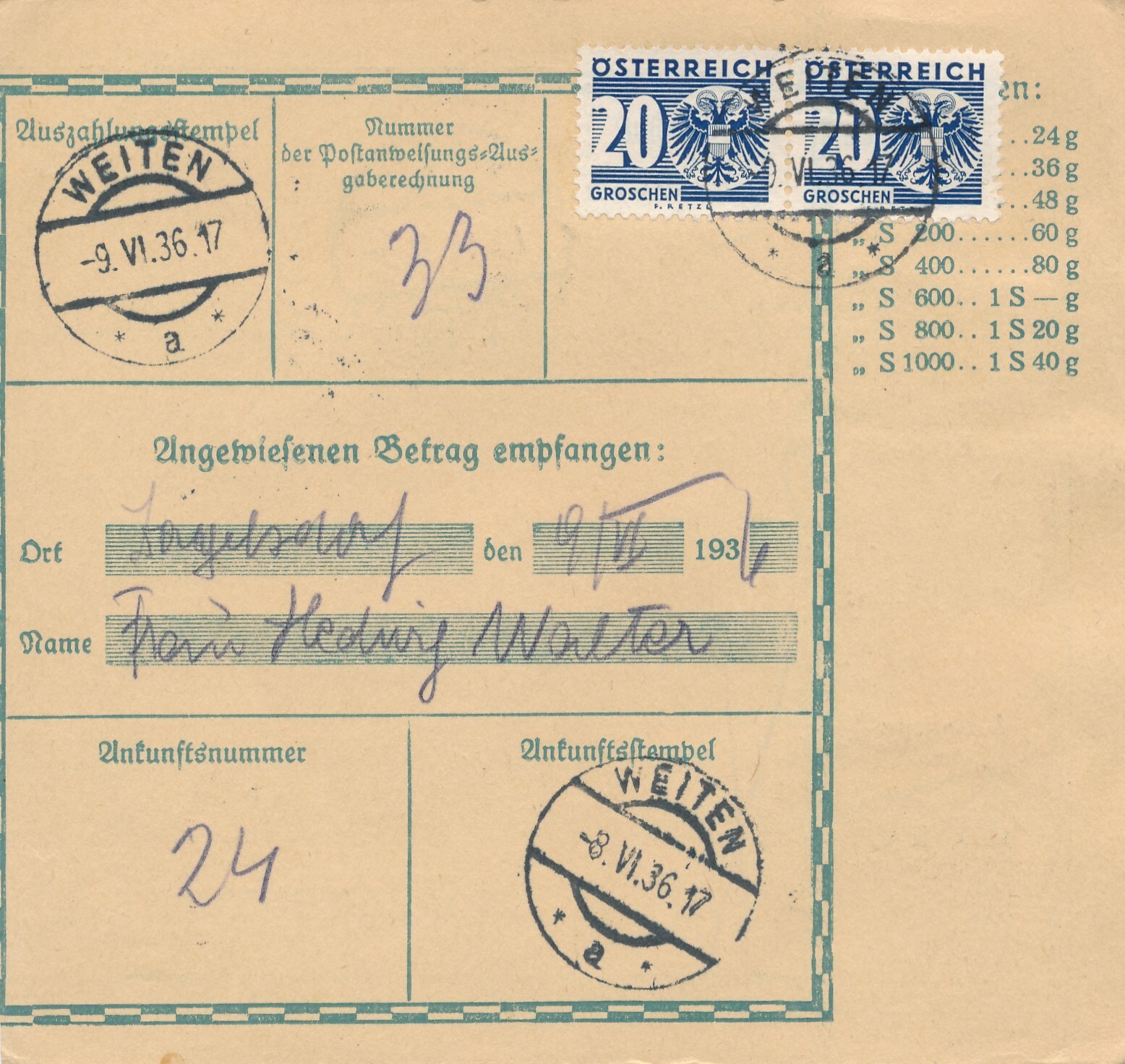 24 Gr. Postanweisung 1936 aus Wien nach Weiten + Trachten Marken (10414)