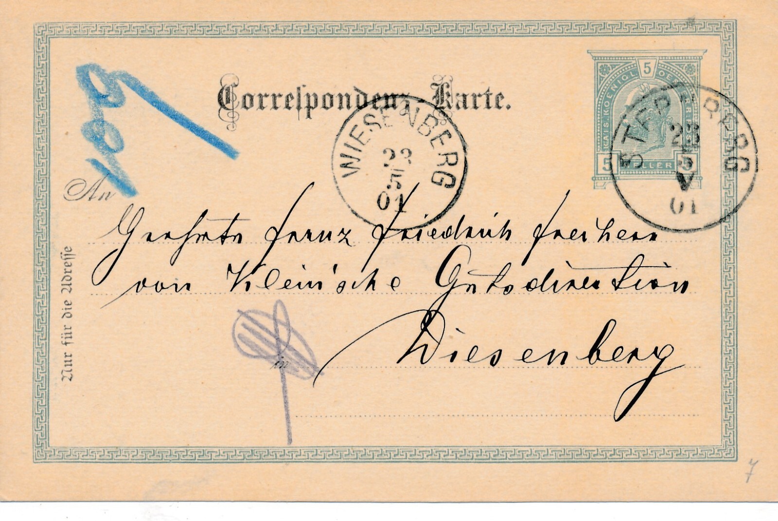 5 Heller Ganzsachen - Karte 1901 aus Wiesenberg (8387)