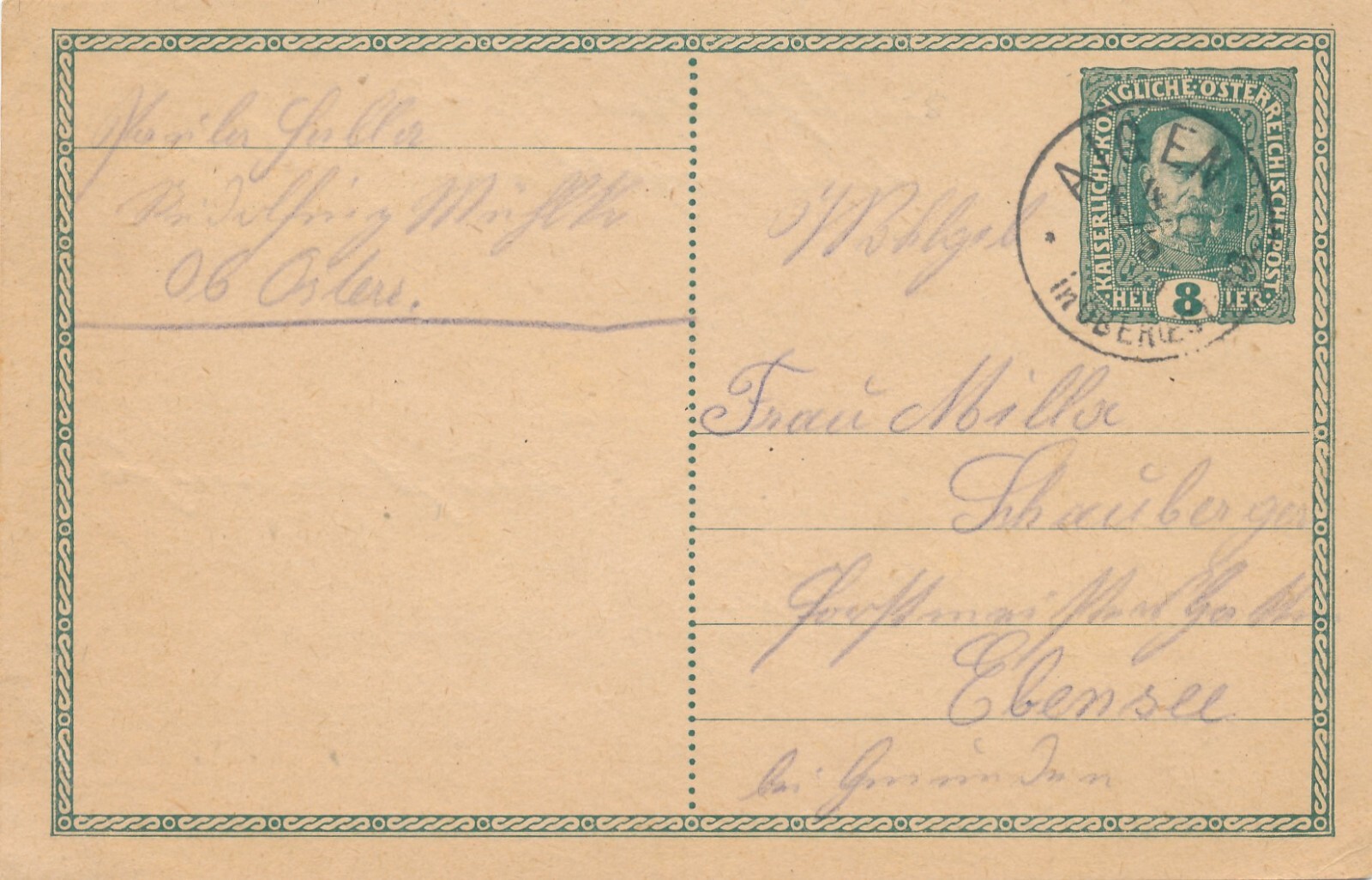 8 Heller Ganzsachen - Karte 1911 aus Aigen (11002)