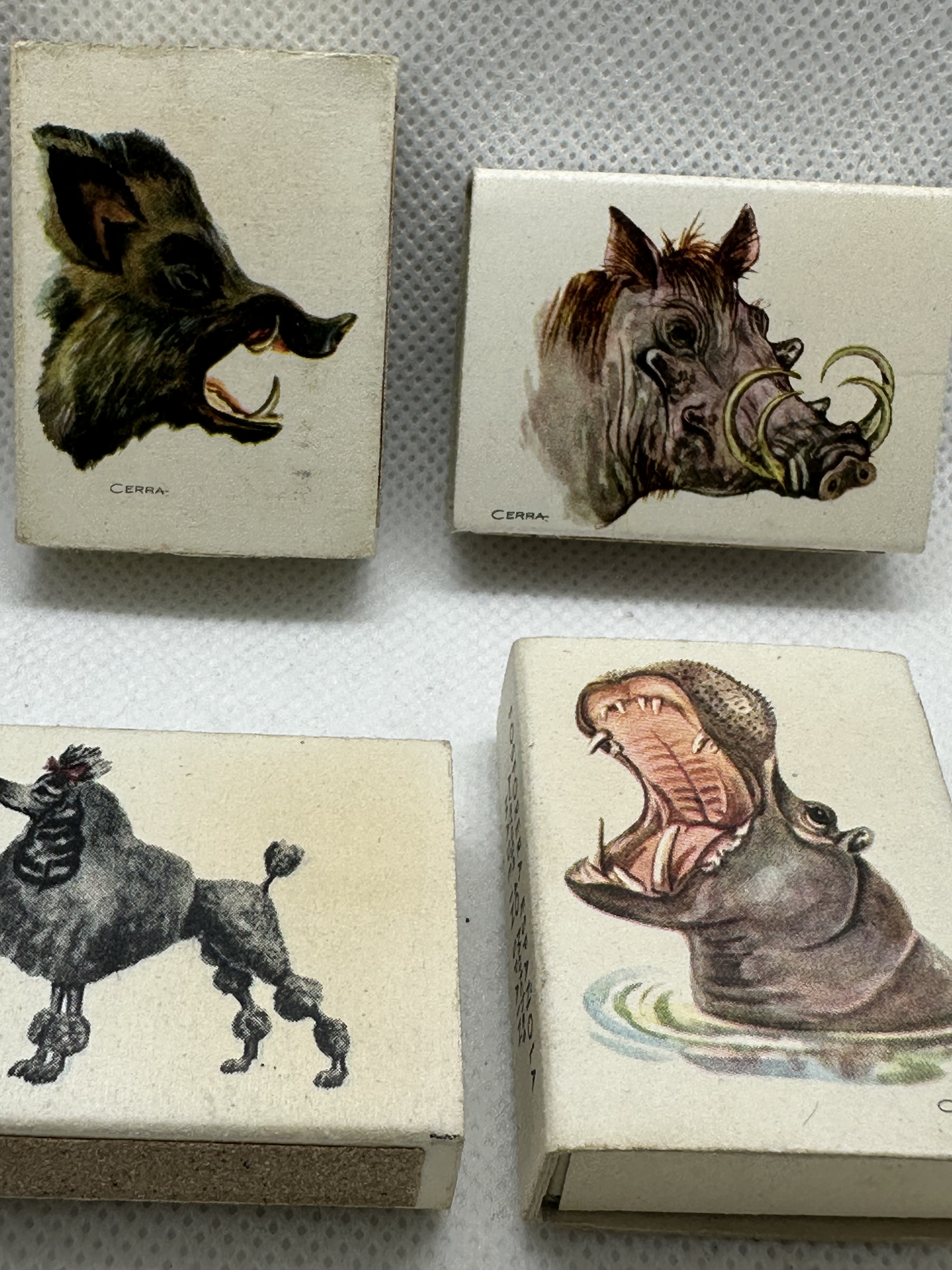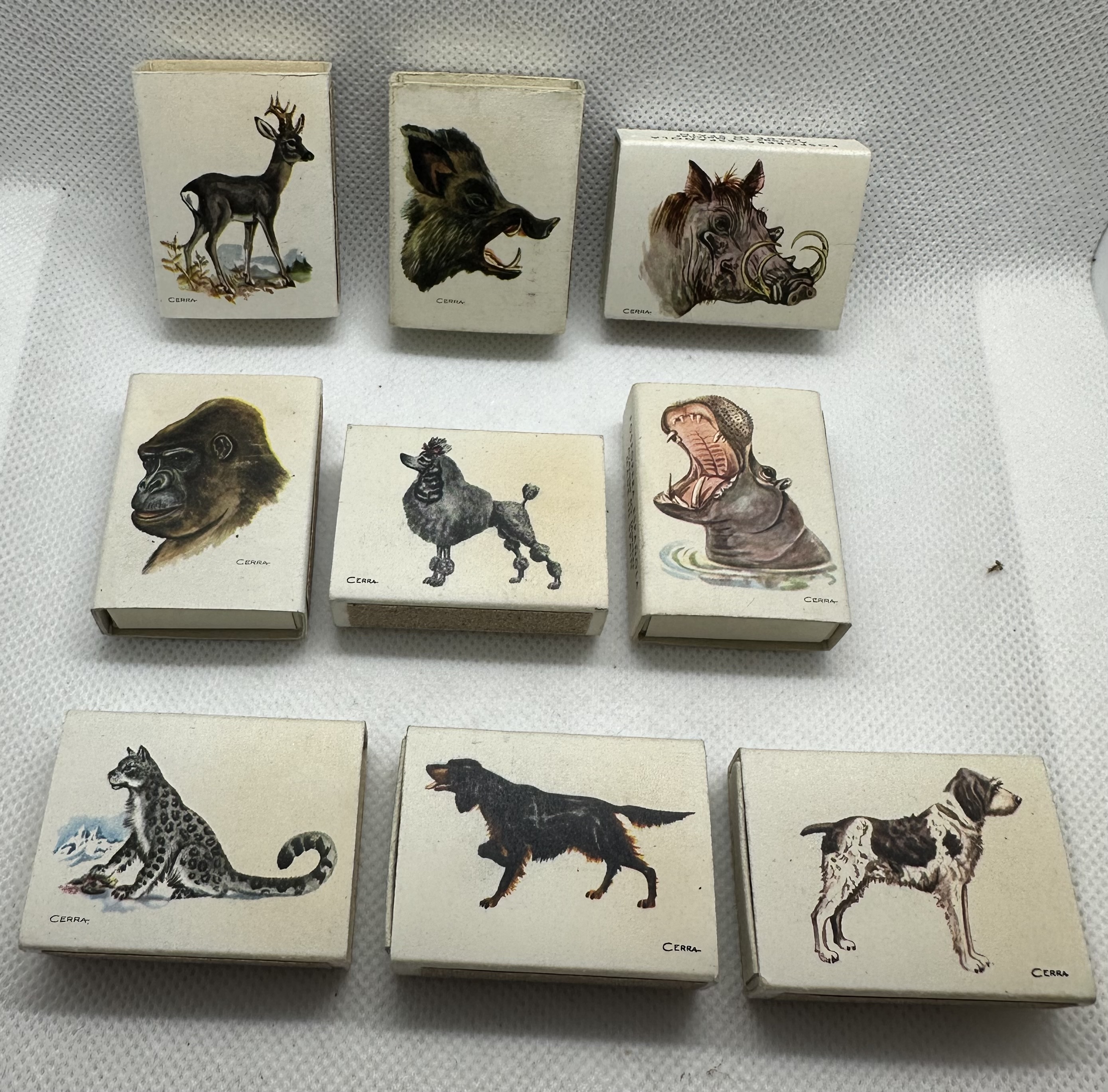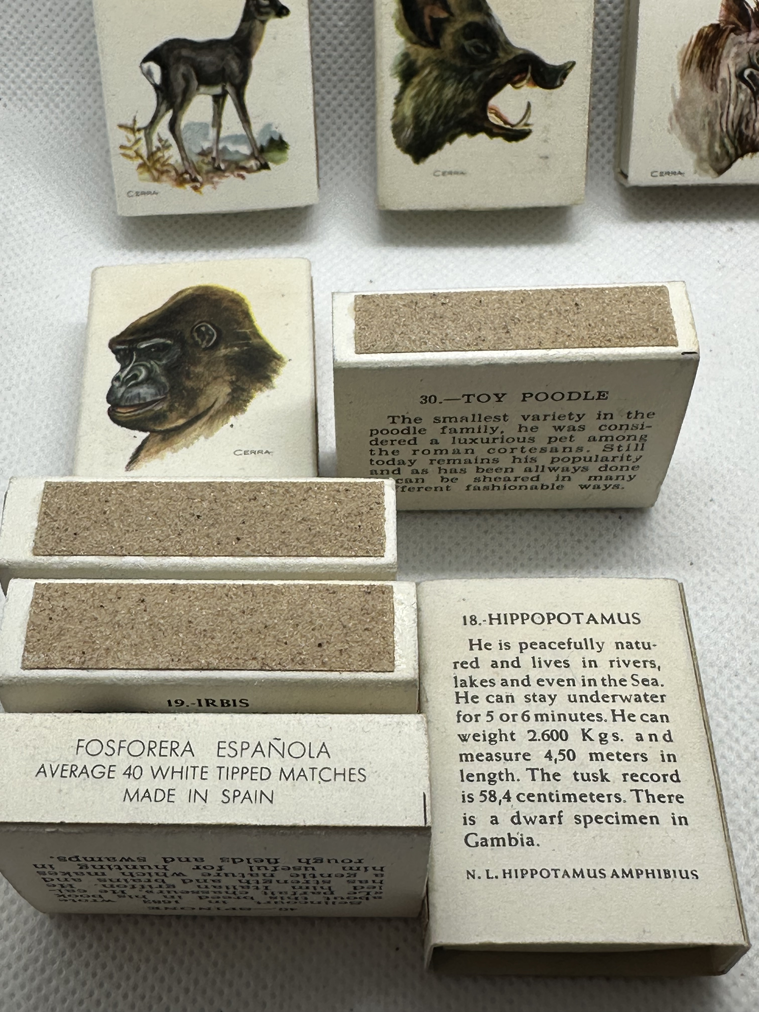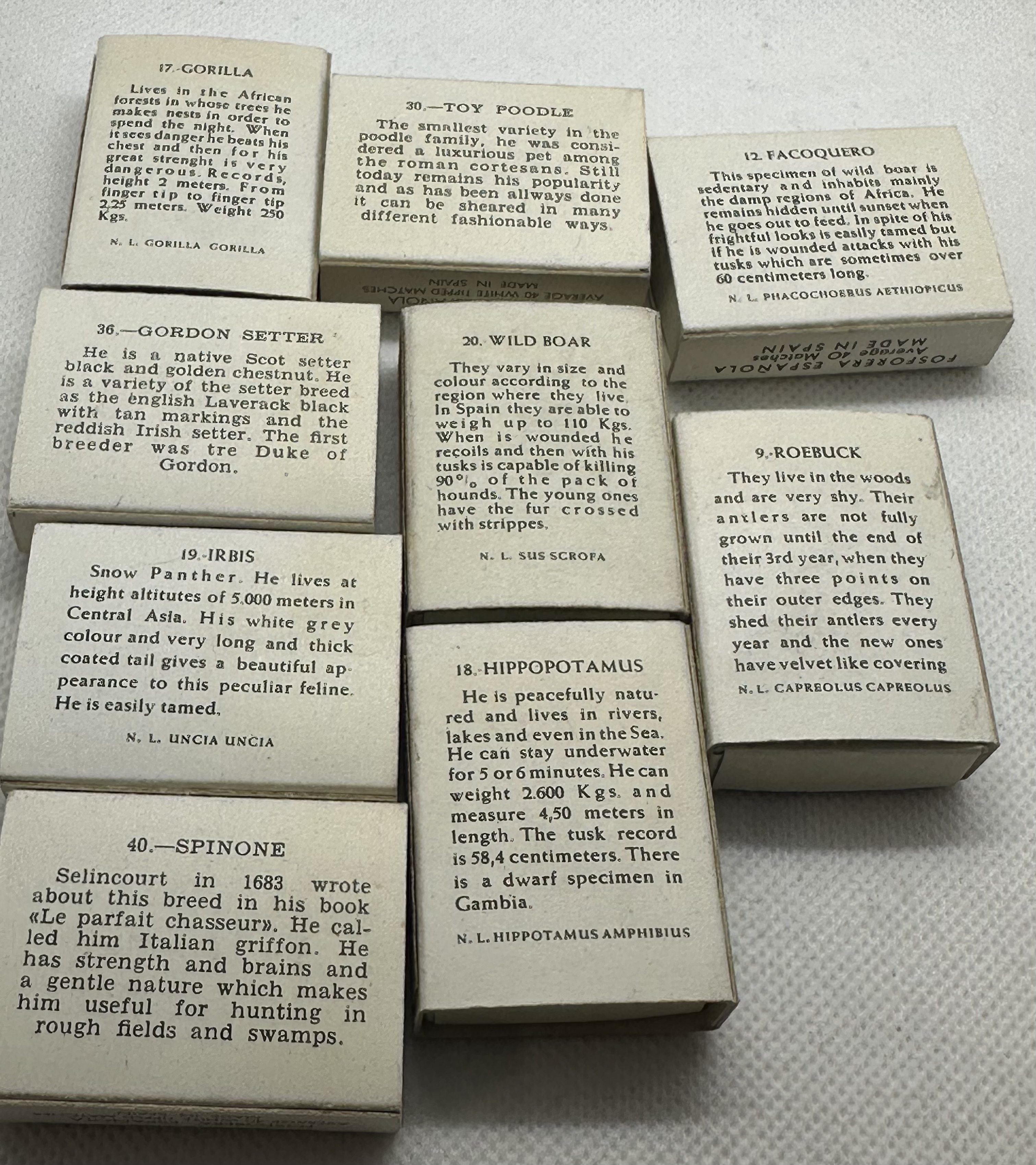 9 Stk. verschiedene antike Zündholzschachteln aus Spanien - Firma Fosforera - Thema Tiere- für SAMMLER!
