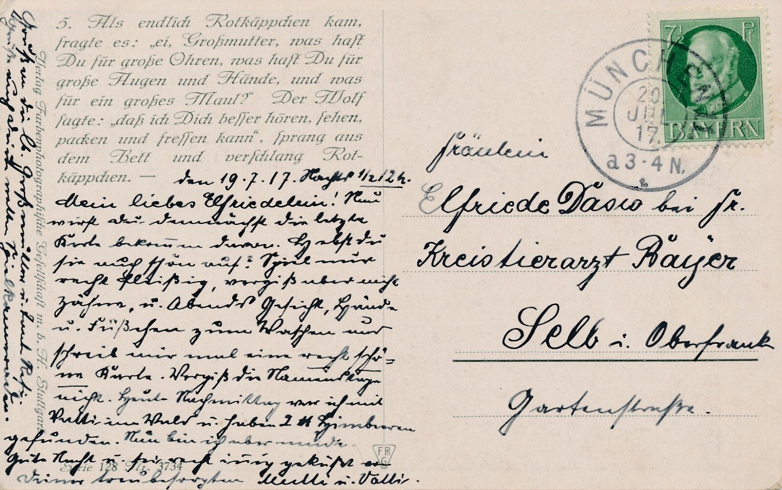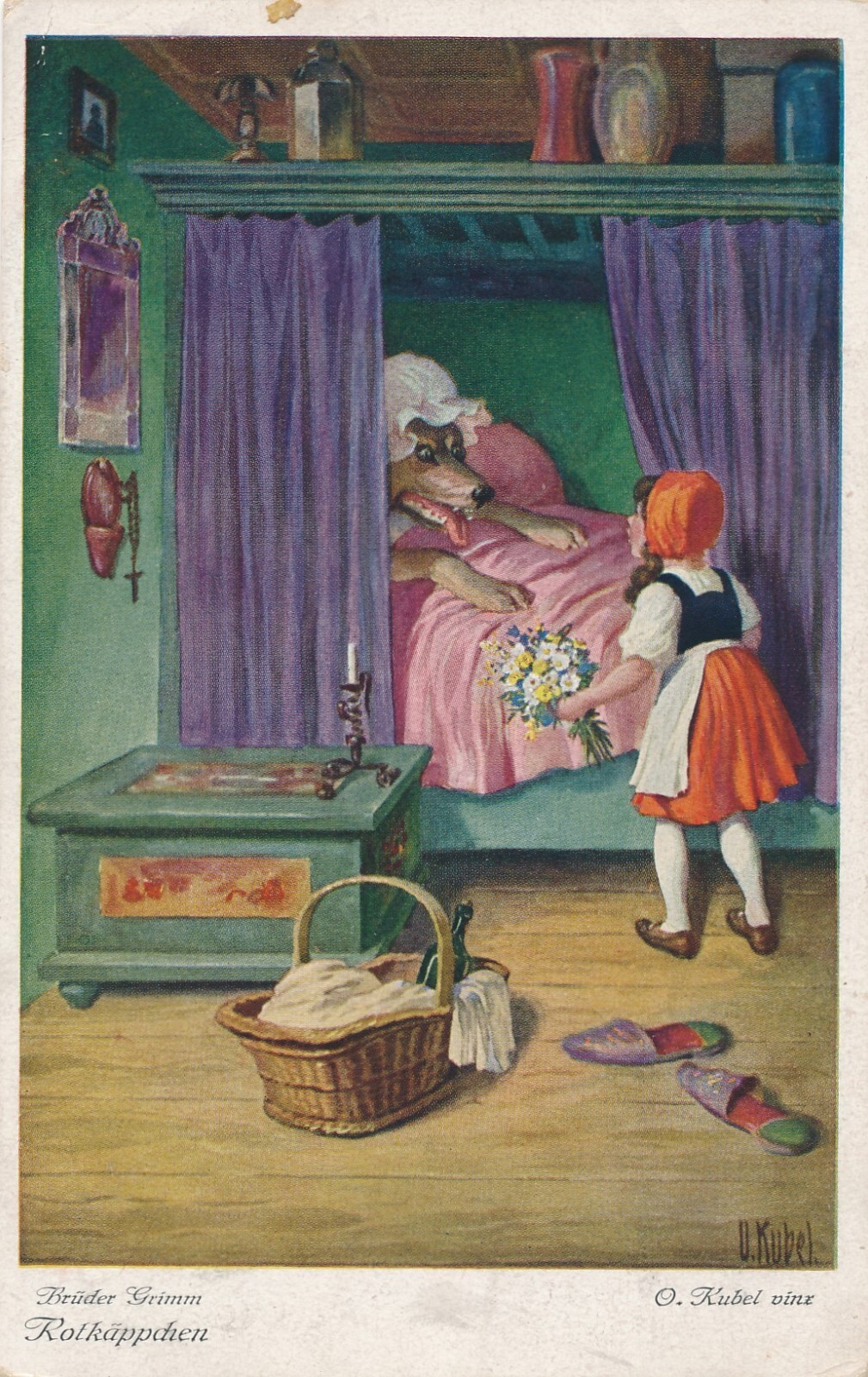 AK, Brüder Grimm, Rotkäppchen neben verkleideten Wolf im Bett (S1644)