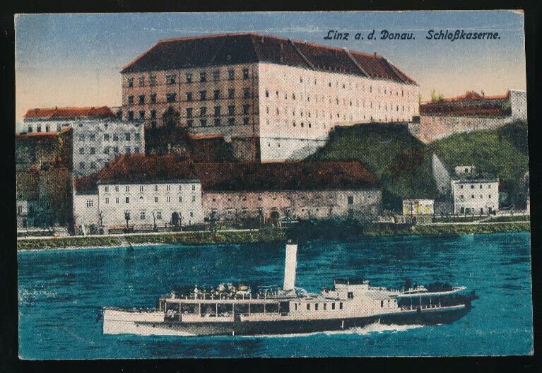 AK Linz an der Donau Schloßkaserne mit Dampfer Oberösterreich (1949)
