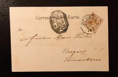Die Karte ist am 26.10.1898 gelaufen und nach Bregenz (Römerstraße) adressiert. Sie trägt eine schöne, klar gestempelte österreichische 5-Kreuzer-Marke, begleitet vom typischen Rechteckstempel.