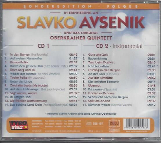 ![]() CD In Erinnerung an Slavko Avsenik und das Original Oberkrainer Quintett - Seine grossen Erfolge Sonstiges: Zustand: spielt einwandfrei Interne Nummer :134 |