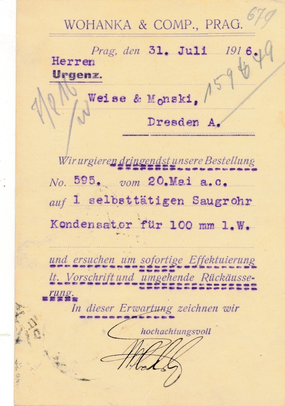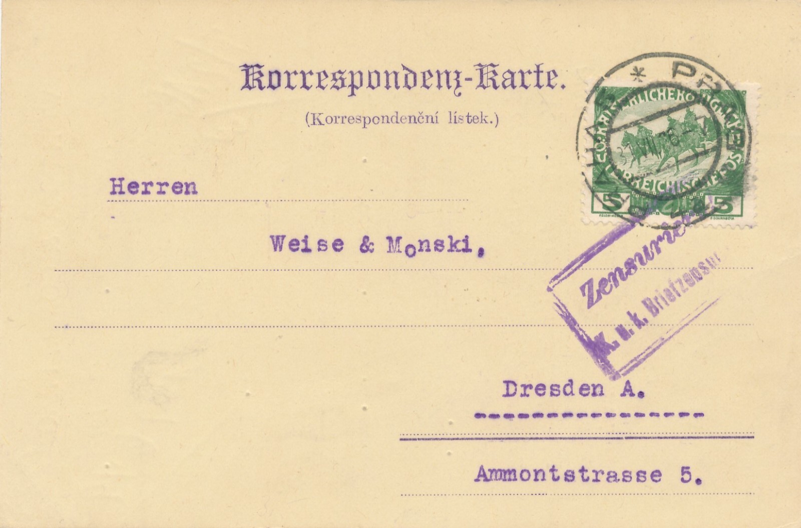 Geschäfts - Postkarte 1916 aus Prag Weise und Monski (8538)