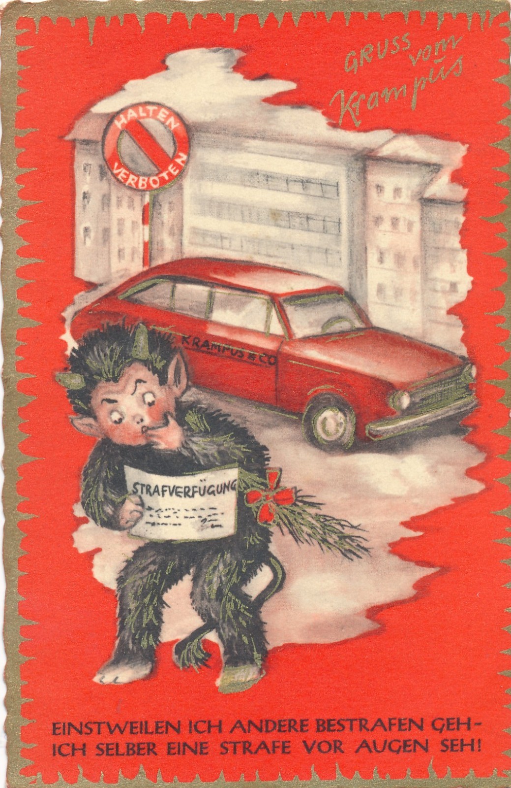 Glückwunschkarte Krampus mit Auto Ansichtskarte (15643)