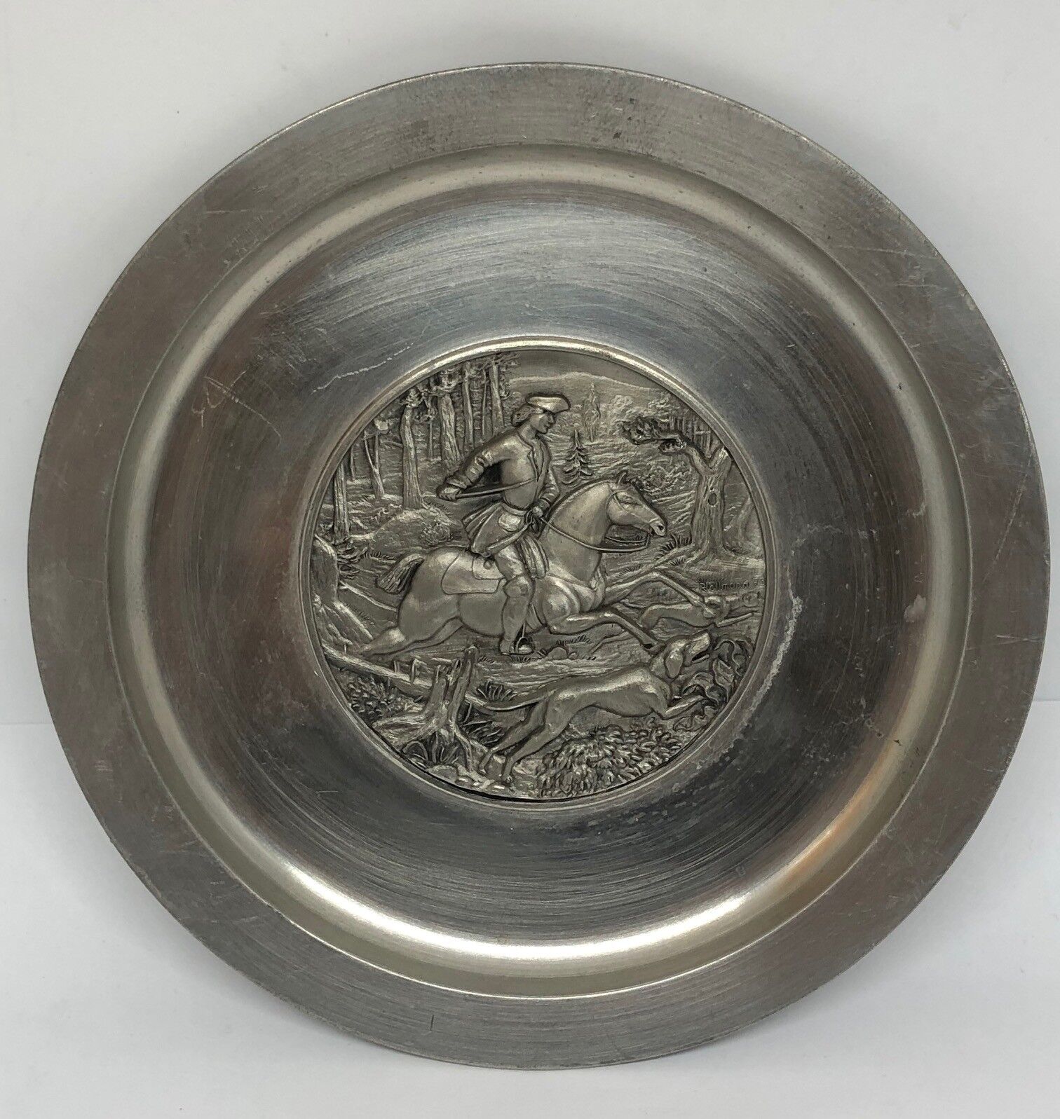 Jagd Zinnteller Jagdszene Jagdhund Reiter sign. Hollmann 18 cm 25559