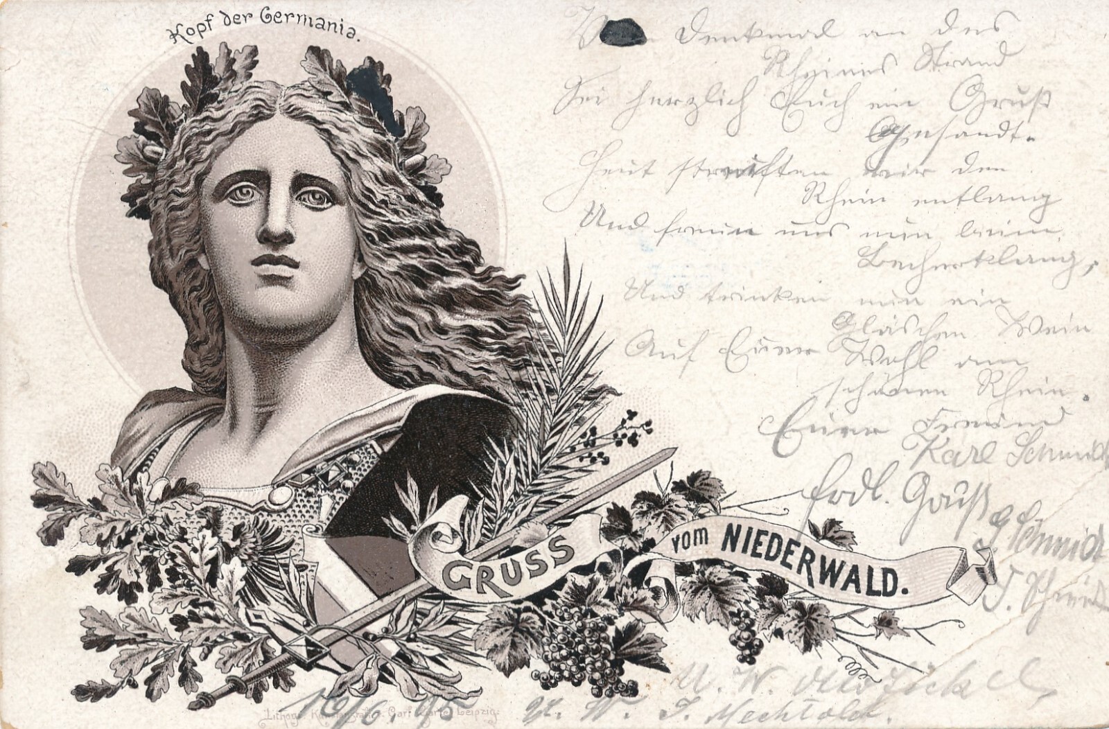 Litho - Karte gruss vom Niederwald mit Kopf der Germania (7266)
