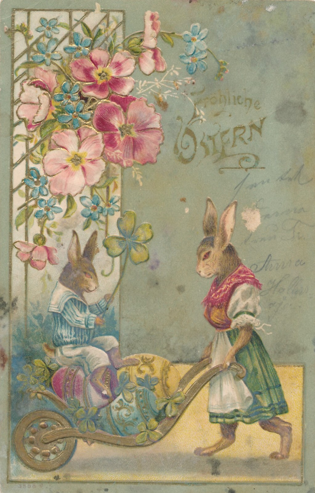 Litho - Präge - Karte Fröhliche Ostern mit Hasen Ansichtskarte (8635)