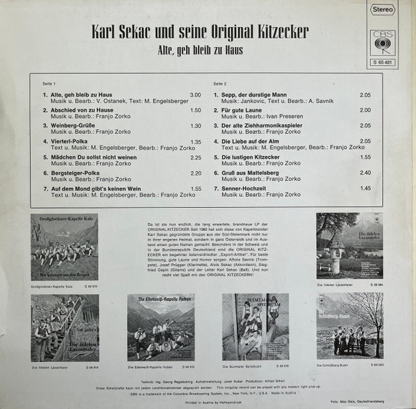 LP / Karl Sekac Und Seine Original Kitzecker – Alte, Geh Bleib Zu Haus