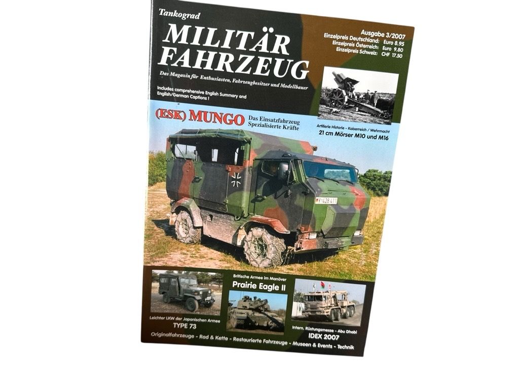 Bemerkungen: Ausgabe des Fachmagazins "Tankograd - Militärfahrzeug" vom Jahrgang 2007, das sich an Militärhistoriker, Fahrzeugbesitzer und Modellbauer richtet. Hauptthema: Das Einsatzfahrzeug Spezialisierte Kräfte (ESK) "Mungo", ein luftverladbares Mehrzweckfahrzeug der Bundeswehr auf Basis des Multicar M30/FUMO. Weiterer Inhalt: Berichte über Artilleriehistorie (21 cm Mörser), britische Manöver und japanische LKWs. Zustand: 2 - Sehr guter Zustand. Leichte äußere Gebrauchsspuren (z.B. minimal abgeriebene Kanten), innen jedoch sauber und ohne Markierungen. Bindung fest. Regalux 5 oben hinten
