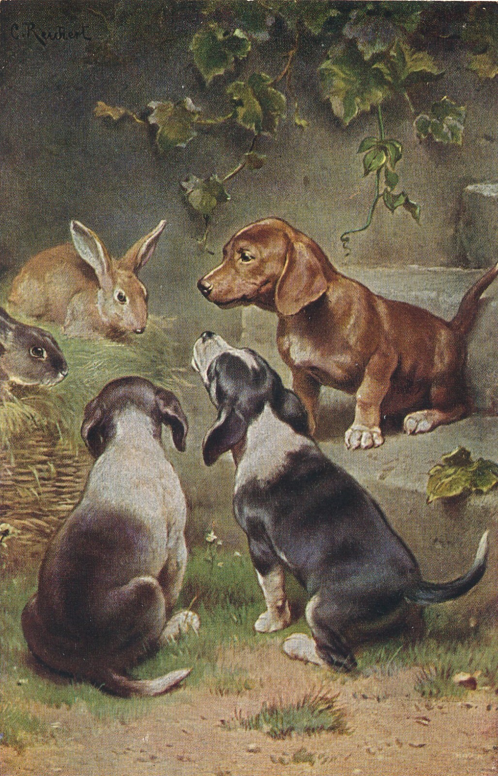 Motiv - Karte von drei Dackeln mit Hasen Ansichtskarte (10368)