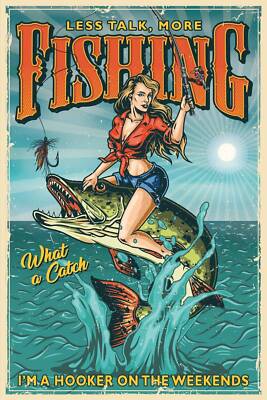 Nostalgie schild less talk more fishing frau 12x18 / 20x30 / 30x40 blech od.holz