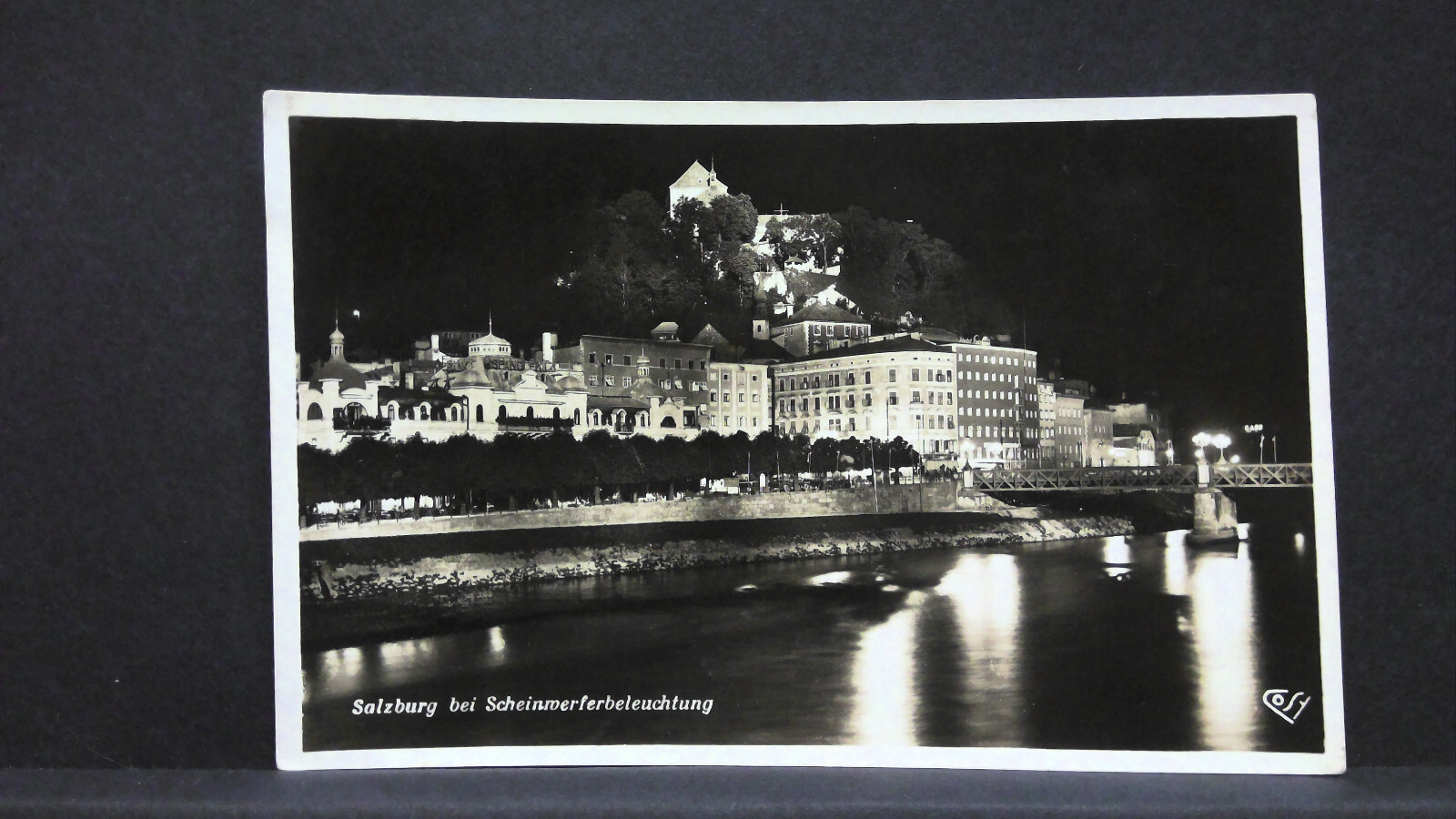 Salzburg bei Scheinwerferbeleuchtung Nacht Salzach JW165868
