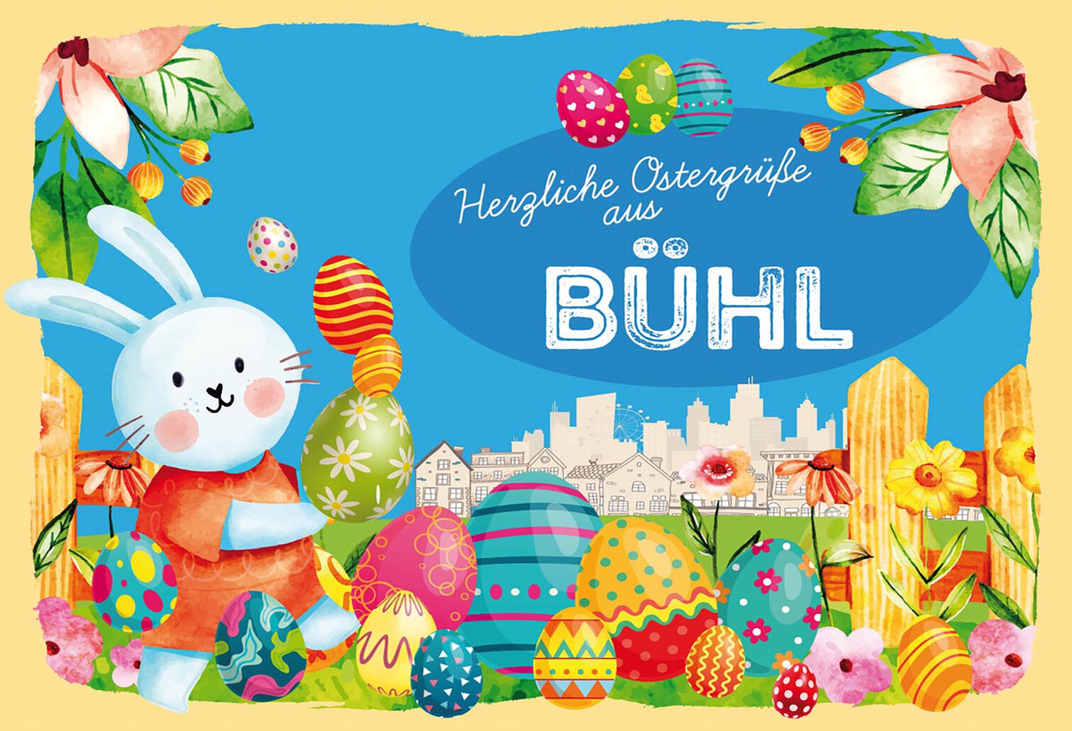 Schild Spruch Herzliche Ostergrüße aus Bühl Osterhase Eier Comic JW