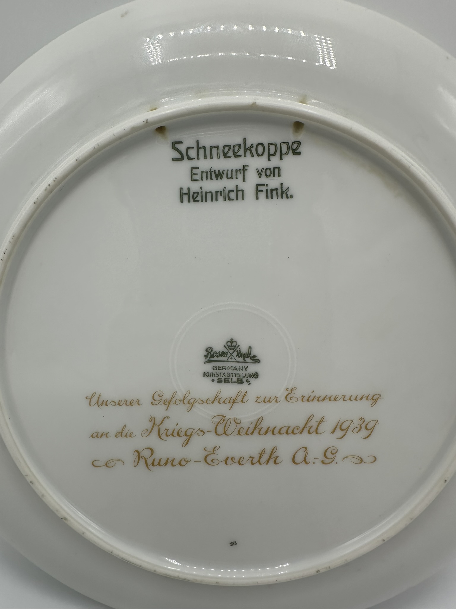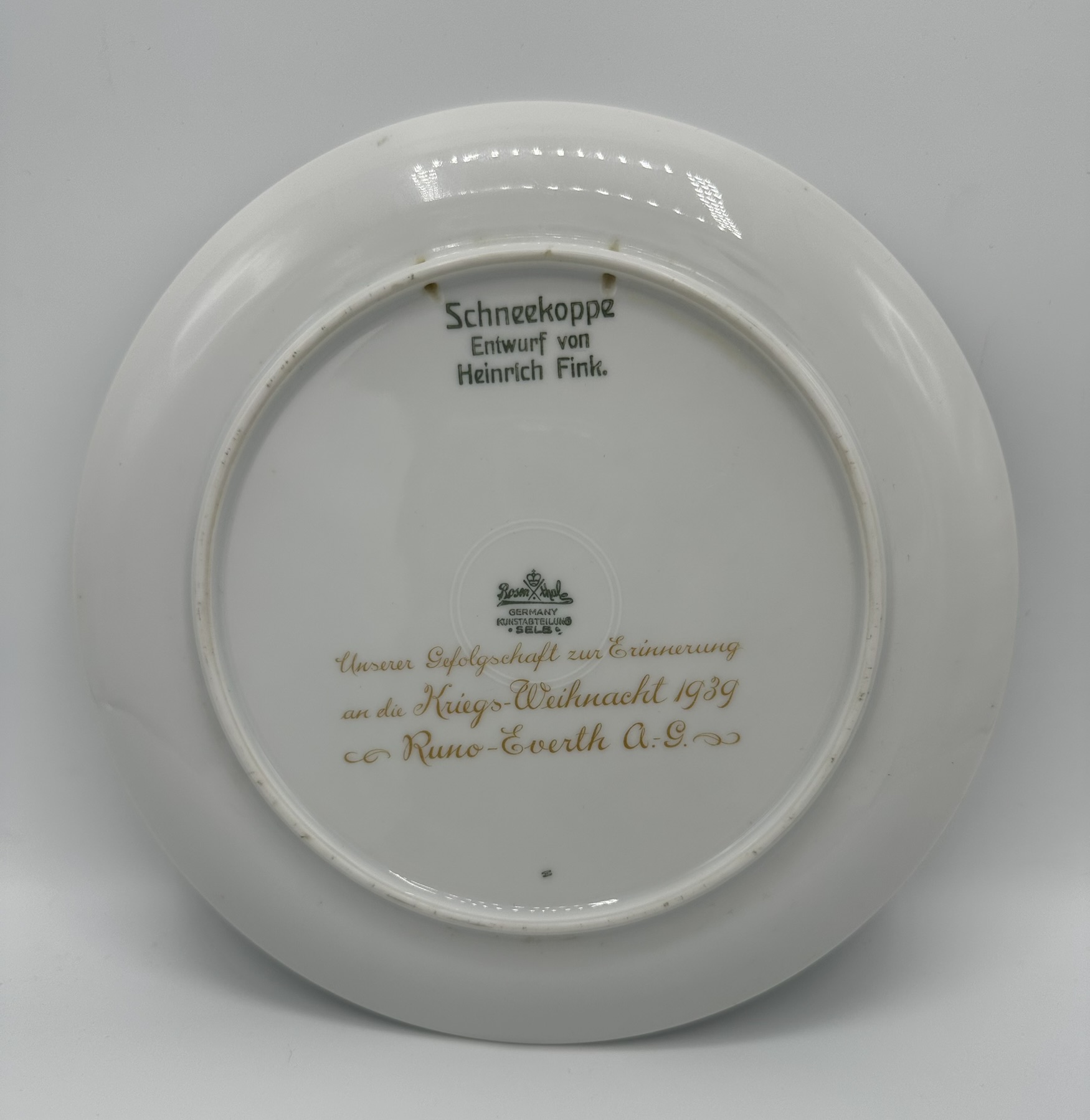 Rosenthal Weihnachtsteller von 1939, gemarkt Rosenthal Selb-Bavaria, unterglasurgrüne Manufakturmarke sowie 3-zeiliger unterglasgrüner Schriftzug,