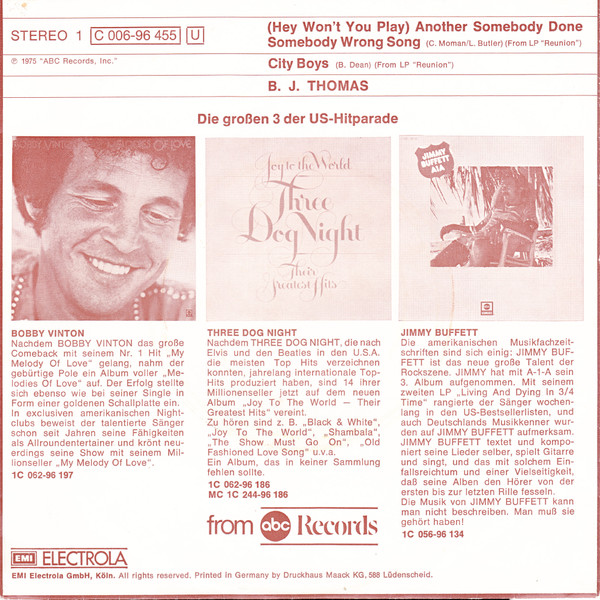 Vinyl / B.J. Thomas - (Hey Won't You Play) Another Somebody Done Somebody Wrong Song