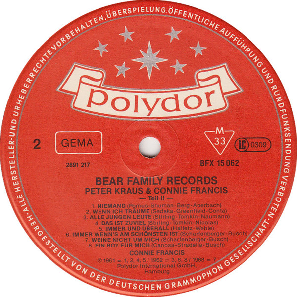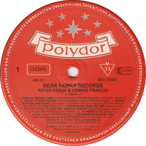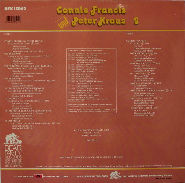 Connie Francis, Peter Kraus - Connie Francis Und Peter Kraus 2Format: Vinyl, LP, Compilation, ReissueLabel: Bear Family Records - Cat#: BFX 15062Released: GermanyGenre/Style: Rock, Pop, Rock & Roll, Vocal, SchlagerMedia Condition: Near Mint (NM or M-)Sleeve Condition: Near Mint (NM or M-)Tracklist:A1. Darlin' Meine LiebeA2. Twenty Four HoursA3. Mondschein Und LiebeA4. Everybody Else But MeA5. Sag Mir Was Du DenkstA6. Je Pense A ToyA7. Ein Rendezvous Mit DirA8. C'Est Toi La Plus BelleB1. NiemandB...