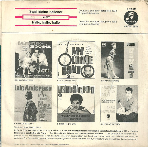 Vinyl / Conny Froboess - Zwei Kleine Italiener / Hallo, Hallo, Hallo