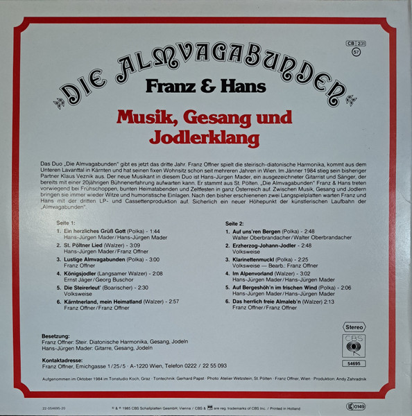 Vinyl / "Die Almvagabunden" Franz & Hans* - Musik, Gesang Und Jodlerklang