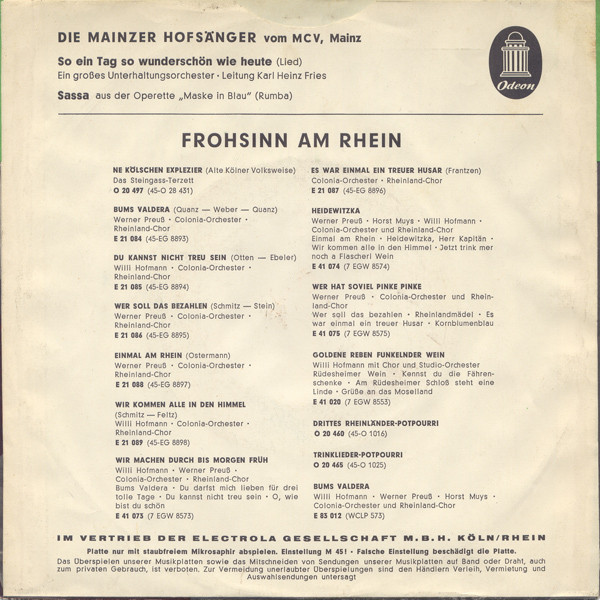 Vinyl / Die Mainzer Hofsänger - So Ein Tag So Wunderschön Wie Heute