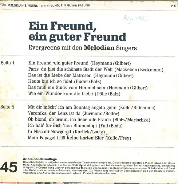 Vinyl / Die Melodian Singers - Ein Freund, Ein Guter Freund