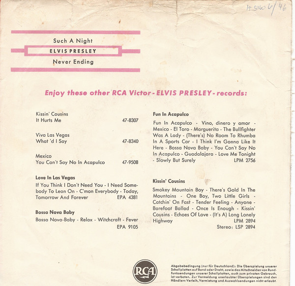Vinyl / Elvis Presley With The Jordanaires - Such A Night / Never Ending