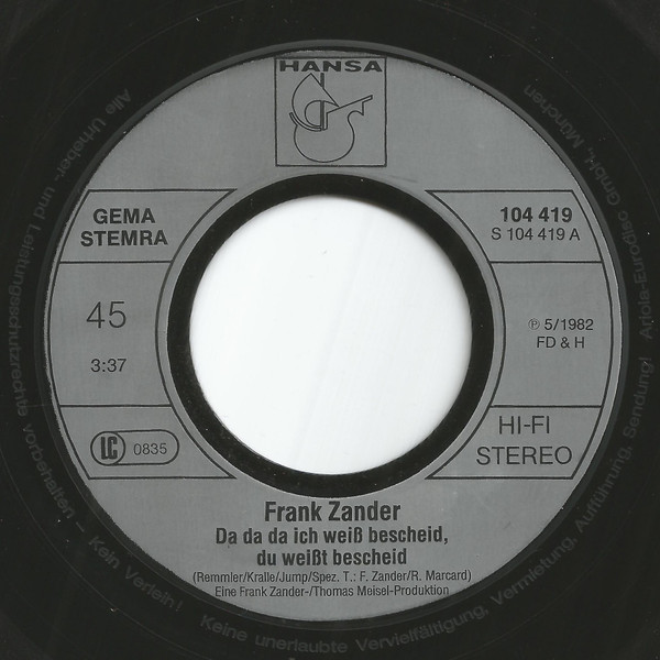 Vinyl / Frank Zander - Da Da Da Ich Weiß Bescheid, Du Weißt Bescheid