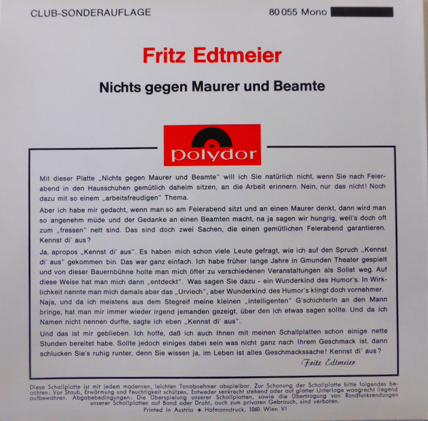 Vinyl / Fritz Edtmeier - Nichts Gegen Maurer Und Beamte