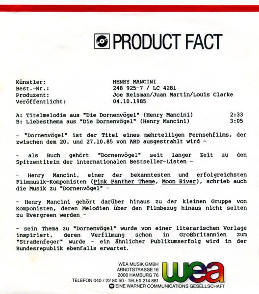 Vinyl / Henry Mancini Und Sein Orchester*, Juan Martin - Die Dornenvögel