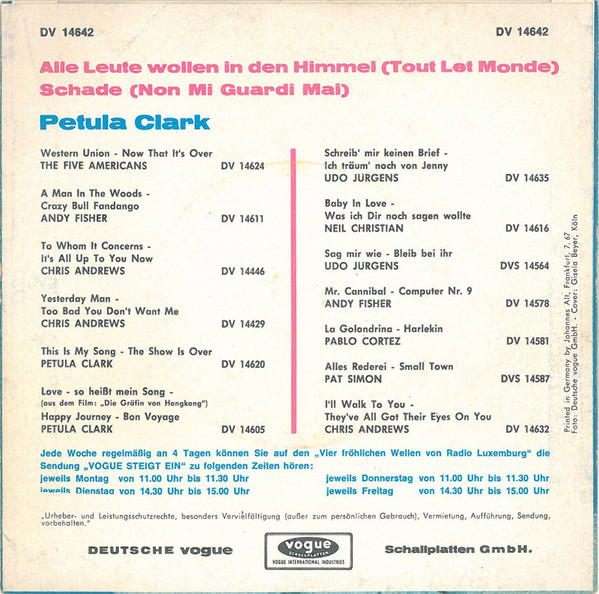Vinyl / Petula Clark - Alle Leute Wollen In Den Himmel / Schade